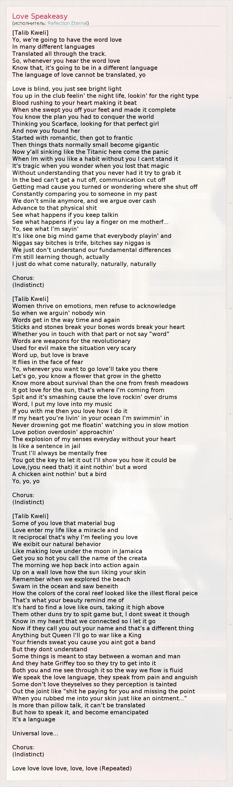 [Talib Kweli] Yo, we're going to have the word love In many different languages Translated all through the track. So, whenever you hear the word love Know that, it's going to be in a different language The language of love cannot be translated, yo Love is blind, you just see bright light You up in the club feelin' the night life, lookin' for the right type Blood rushing to your heart making it beat When she swept you off your feet and made it complete You know the plan you had to conquer the world Thinking you Scarface, looking for that perfect girl And now you found her Started with romantic, then got to frantic Then things thats normally small become gigantic Now y'all sinking like the Titanic here come the panic When Im with you like a habit without you I cant stand it It's tragic when you wonder when you lost that magic Without understanding that you never had it try to grab it In the bed can't get a nut off, communication cut off Getting mad cause you turned or wondering where she shut off Constantly comparing you to someone in my past We don't smile anymore, and we argue over cash Advance to that physical shit See what happens if you keep talkin See what happens if you lay a finger on me motherf... Yo, see what I'm sayin' It's like one big mind game that everybody playin' and Niggas say bitches is trife, bitches say niggas is We just don't understand our fundamental differences I'm still learning though, actually I just do what come naturally, naturally, naturally Chorus: (Indistinct) [Talib Kweli] Women thrive on emotions, men refuse to acknowledge So when we arguin' nobody win Words get in the way time and again Sticks and stones break your bones words break your heart Whether you in touch with that part or not say "word" Words are weapons for the revolutionary Used for evil make the situation very scary Word up, but love is brave It flies in the face of fear Yo, wherever you want to go love'll take you there Let's go, you know a flower that grow in the ghetto Know more about survival than the one from fresh meadows It got love for the sun, that's where I'm coming from Spit and it's smashing cause the love rockin' over drums Word, I put my love into my music If you with me then you love how I do it If my heart you're livin' in your ocean I'm swimmin' in Never drowning got me floatin' watching you in slow motion Love potion overdosin' approachin' The explosion of my senses everyday without your heart Is like a sentence in jail Trust I'll always be mentally free You got the key to let it out I'll show you how it could be Love,(you need that) it aint nothin' but a word A chicken aint nothin' but a bird Yo, yo, yo Chorus: (Indistinct) [Talib Kweli] Some of you love that material bug Love enter my life like a miracle and It reciprocal that's why I'm feeling you love We exibit our natural behavior Like making love under the moon in Jamaica Get you so hot you call the name of the creata The morning we hop back into action again Up on a wall love how the sun liking your skin Remember when we explored the beach Swam in the ocean and saw beneith How the colors of the coral reef looked like the illest floral peice That's what your beauty remind me of It's hard to find a love like ours, taking it high above Them other duns try to spit game but, I dont sweat it though Know in my heart that we connected so I let it go Now if they call you out your name and that's a different thing Anything but Queen I'll go to war like a King Your friends sweat you cause you aint got a band But they dont understand Some things is meant to stay between a woman and man And they hate Griffey too so they try to get into it Both you and me see through it so the way we flow is fluid We speak the love language, they speak from pain and anguish Some don't love theyselves so they perception is tainted Out the joint like "shit he paying for you and missing the point When you rubbed me into your skin just like an ointment..." Is more than pillow talk, it can't be translated But how to speak it, and become emancipated It's a language Universal love... Chorus: (Indistinct) Love love love love, love, love (Repeated)