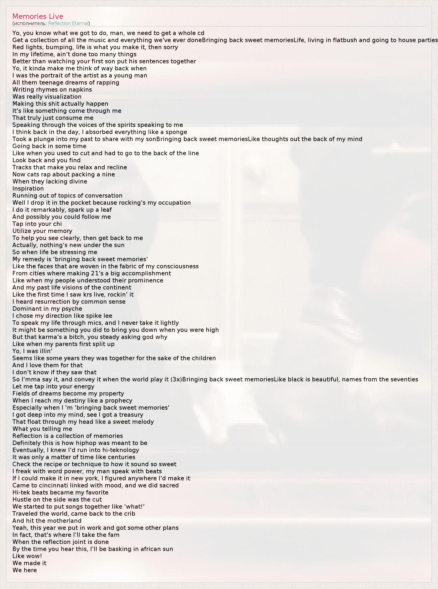 Yo, you know what we got to do, man, we need to get a whole cd Get a collection of all the music and everything we've ever doneBringing back sweet memoriesLife, living in flatbush and going to house parties Red lights, bumping, life is what you make it, then sorry In my lifetime, ain't done too many things Better than watching your first son put his sentences together Yo, it kinda make me think of way back when I was the portrait of the artist as a young man All them teenage dreams of rapping Writing rhymes on napkins Was really visualization Making this shit actually happen It's like something come through me That truly just consume me Speaking through the voices of the spirits speaking to me I think back in the day, I absorbed everything like a sponge Took a plunge into my past to share with my sonBringing back sweet memoriesLike thoughts out the back of my mind Going back in some time Like when you used to cut and had to go to the back of the line Look back and you find Tracks that make you relax and recline Now cats rap about packing a nine When they lacking divine Inspiration Running out of topics of conversation Well I drop it in the pocket because rocking's my occupation I do it remarkably, spark up a leaf And possibly you could follow me Tap into your chi Utilize your memory To help you see clearly, then get back to me Actually, nothing's new under the sun So when life be stressing me My remedy is 'bringing back sweet memories' Like the faces that are woven in the fabric of my consciousness From cities where making 21's a big accomplishment Like when my people understood their prominence And my past life visions of the continent Like the first time I saw krs live, rockin' it I heard resurrection by common sense Dominant in my psyche I chose my direction like spike lee To speak my life through mics, and I never take it lightly It might be something you did to bring you down when you were high But that karma's a bitch, you steady asking god why Like when my parents first split up Yo, I was illin' Seems like some years they was together for the sake of the children And I love them for that I don't know if they saw that So I'mma say it, and convey it when the world play it (3x)Bringing back sweet memoriesLike black is beautiful, names from the seventies Let me tap into your energy Fields of dreams become my property When I reach my destiny like a prophecy Especially when I 'm 'bringing back sweet memories' I got deep into my mind, see I got a treasury That float through my head like a sweet melody What you telling me Reflection is a collection of memories Definitely this is how hiphop was meant to be Eventually, I knew I'd run into hi-teknology It was only a matter of time like centuries Check the recipe or technique to how it sound so sweet I freak with word power, my man speak with beats If I could make it in new york, I figured anywhere I'd make it Came to cincinnati linked with mood, and we did sacred Hi-tek beats became my favorite Hustle on the side was the cut We started to put songs together like 'what!' Traveled the world, came back to the crib And hit the motherland Yeah, this year we put in work and got some other plans In fact, that's where I'll take the fam When the reflection joint is done By the time you hear this, I'll be basking in african sun Like wow! We made it We here