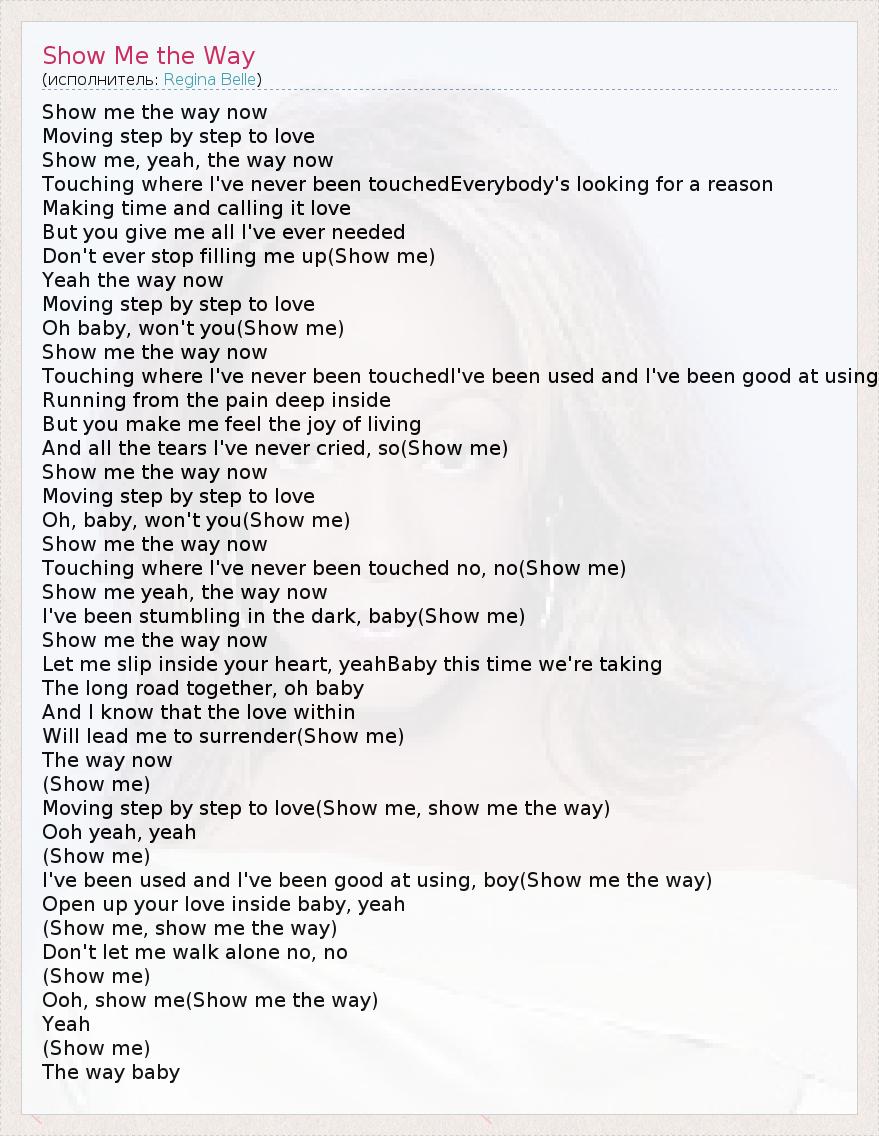 Show me the way now Moving step by step to love Show me, yeah, the way now Touching where I've never been touchedEverybody's looking for a reason Making time and calling it love But you give me all I've ever needed Don't ever stop filling me up(Show me) Yeah the way now Moving step by step to love Oh baby, won't you(Show me) Show me the way now Touching where I've never been touchedI've been used and I've been good at using Running from the pain deep inside But you make me feel the joy of living And all the tears I've never cried, so(Show me) Show me the way now Moving step by step to love Oh, baby, won't you(Show me) Show me the way now Touching where I've never been touched no, no(Show me) Show me yeah, the way now I've been stumbling in the dark, baby(Show me) Show me the way now Let me slip inside your heart, yeahBaby this time we're taking The long road together, oh baby And I know that the love within Will lead me to surrender(Show me) The way now (Show me) Moving step by step to love(Show me, show me the way) Ooh yeah, yeah (Show me) I've been used and I've been good at using, boy(Show me the way) Open up your love inside baby, yeah (Show me, show me the way) Don't let me walk alone no, no (Show me) Ooh, show me(Show me the way) Yeah (Show me) The way baby