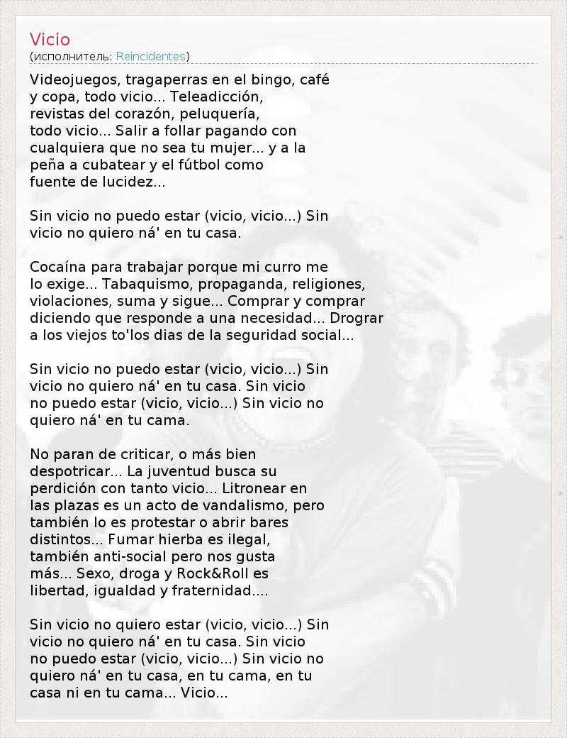 Videojuegos, tragaperras en el bingo, café y copa, todo vicio... Teleadicción, revistas del corazón, peluquería, todo vicio... Salir a follar pagando con cualquiera que no sea tu mujer... y a la peña a cubatear y el fútbol como fuente de lucidez... Sin vicio no puedo estar (vicio, vicio...) Sin vicio no quiero ná' en tu casa. Cocaína para trabajar porque mi curro me lo exige... Tabaquismo, propaganda, religiones, violaciones, suma y sigue... Comprar y comprar diciendo que responde a una necesidad... Drograr a los viejos to'los dias de la seguridad social... Sin vicio no puedo estar (vicio, vicio...) Sin vicio no quiero ná' en tu casa. Sin vicio no puedo estar (vicio, vicio...) Sin vicio no quiero ná' en tu cama. No paran de criticar, o más bien despotricar... La juventud busca su perdición con tanto vicio... Litronear en las plazas es un acto de vandalismo, pero también lo es protestar o abrir bares distintos... Fumar hierba es ilegal, también anti-social pero nos gusta más... Sexo, droga y Rock&Roll es libertad, igualdad y fraternidad.... Sin vicio no quiero estar (vicio, vicio...) Sin vicio no quiero ná' en tu casa. Sin vicio no puedo estar (vicio, vicio...) Sin vicio no quiero ná' en tu casa, en tu cama, en tu casa ni en tu cama... Vicio...