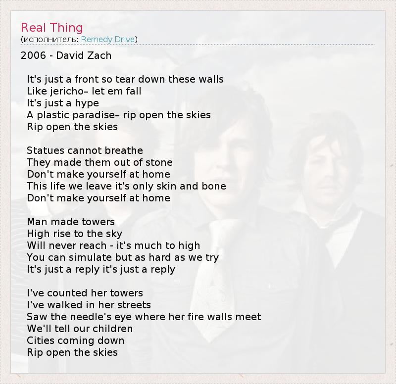 2006 - David Zach It's just a front so tear down these walls Like jericho– let em fall It's just a hype A plastic paradise– rip open the skies Rip open the skies Statues cannot breathe They made them out of stone Don't make yourself at home This life we leave it's only skin and bone Don't make yourself at home Man made towers High rise to the sky Will never reach - it's much to high You can simulate but as hard as we try It's just a reply it's just a reply I've counted her towers I've walked in her streets Saw the needle's eye where her fire walls meet We'll tell our children Cities coming down Rip open the skies