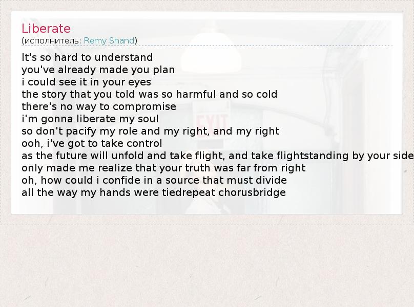 It's so hard to understand you've already made you plan i could see it in your eyes the story that you told was so harmful and so cold there's no way to compromise i'm gonna liberate my soul so don't pacify my role and my right, and my right ooh, i've got to take control as the future will unfold and take flight, and take flightstanding by your side only made me realize that your truth was far from right oh, how could i confide in a source that must divide all the way my hands were tiedrepeat chorusbridge