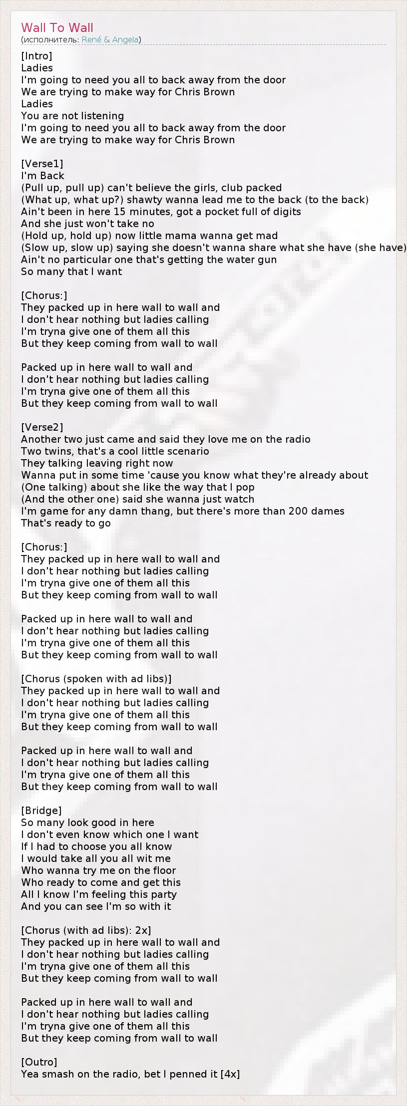 [Intro] Ladies I'm going to need you all to back away from the door We are trying to make way for Chris Brown Ladies You are not listening I'm going to need you all to back away from the door We are trying to make way for Chris Brown [Verse1] I'm Back (Pull up, pull up) can't believe the girls, club packed (What up, what up?) shawty wanna lead me to the back (to the back) Ain't been in here 15 minutes, got a pocket full of digits And she just won't take no (Hold up, hold up) now little mama wanna get mad (Slow up, slow up) saying she doesn't wanna share what she have (she have) Ain't no particular one that's getting the water gun So many that I want [Chorus:] They packed up in here wall to wall and I don't hear nothing but ladies calling I'm tryna give one of them all this But they keep coming from wall to wall Packed up in here wall to wall and I don't hear nothing but ladies calling I'm tryna give one of them all this But they keep coming from wall to wall [Verse2] Another two just came and said they love me on the radio Two twins, that's a cool little scenario They talking leaving right now Wanna put in some time 'cause you know what they're already about (One talking) about she like the way that I pop (And the other one) said she wanna just watch I'm game for any damn thang, but there's more than 200 dames That's ready to go [Chorus:] They packed up in here wall to wall and I don't hear nothing but ladies calling I'm tryna give one of them all this But they keep coming from wall to wall Packed up in here wall to wall and I don't hear nothing but ladies calling I'm tryna give one of them all this But they keep coming from wall to wall [Chorus (spoken with ad libs)] They packed up in here wall to wall and I don't hear nothing but ladies calling I'm tryna give one of them all this But they keep coming from wall to wall Packed up in here wall to wall and I don't hear nothing but ladies calling I'm tryna give one of them all this But they keep coming from wall to wall [Bridge] So many look good in here I don't even know which one I want If I had to choose you all know I would take all you all wit me Who wanna try me on the floor Who ready to come and get this All I know I'm feeling this party And you can see I'm so with it [Chorus (with ad libs): 2x] They packed up in here wall to wall and I don't hear nothing but ladies calling I'm tryna give one of them all this But they keep coming from wall to wall Packed up in here wall to wall and I don't hear nothing but ladies calling I'm tryna give one of them all this But they keep coming from wall to wall [Outro] Yea smash on the radio, bet I penned it [4x]