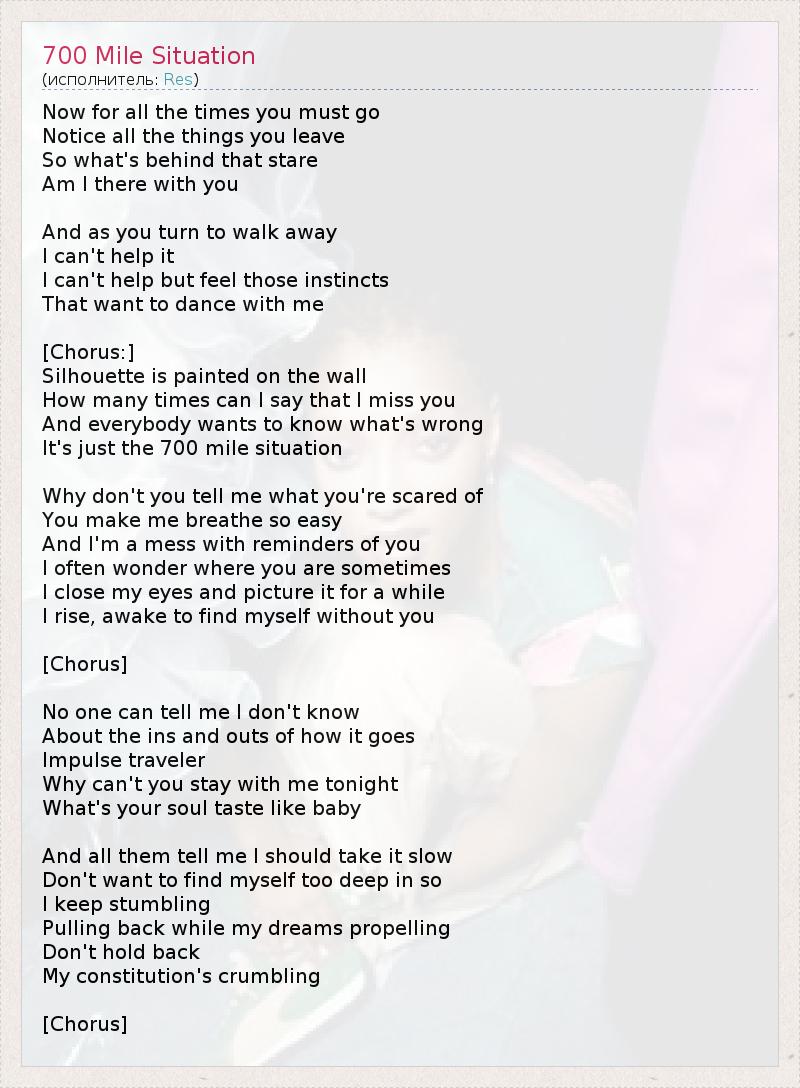 Now for all the times you must go Notice all the things you leave So what's behind that stare Am I there with you And as you turn to walk away I can't help it I can't help but feel those instincts That want to dance with me [Chorus:] Silhouette is painted on the wall How many times can I say that I miss you And everybody wants to know what's wrong It's just the 700 mile situation Why don't you tell me what you're scared of You make me breathe so easy And I'm a mess with reminders of you I often wonder where you are sometimes I close my eyes and picture it for a while I rise, awake to find myself without you [Chorus] No one can tell me I don't know About the ins and outs of how it goes Impulse traveler Why can't you stay with me tonight What's your soul taste like baby And all them tell me I should take it slow Don't want to find myself too deep in so I keep stumbling Pulling back while my dreams propelling Don't hold back My constitution's crumbling [Chorus]