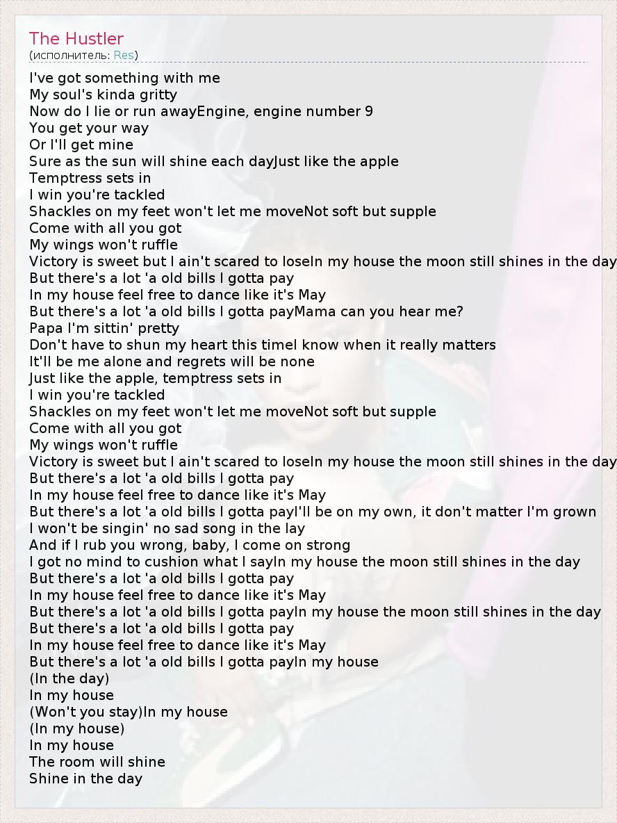 I've got something with me My soul's kinda gritty Now do I lie or run awayEngine, engine number 9 You get your way Or I'll get mine Sure as the sun will shine each dayJust like the apple Temptress sets in I win you're tackled Shackles on my feet won't let me moveNot soft but supple Come with all you got My wings won't ruffle Victory is sweet but I ain't scared to loseIn my house the moon still shines in the day But there's a lot 'a old bills I gotta pay In my house feel free to dance like it's May But there's a lot 'a old bills I gotta payMama can you hear me? Papa I'm sittin' pretty Don't have to shun my heart this timeI know when it really matters It'll be me alone and regrets will be none Just like the apple, temptress sets in I win you're tackled Shackles on my feet won't let me moveNot soft but supple Come with all you got My wings won't ruffle Victory is sweet but I ain't scared to loseIn my house the moon still shines in the day But there's a lot 'a old bills I gotta pay In my house feel free to dance like it's May But there's a lot 'a old bills I gotta payI'll be on my own, it don't matter I'm grown I won't be singin' no sad song in the lay And if I rub you wrong, baby, I come on strong I got no mind to cushion what I sayIn my house the moon still shines in the day But there's a lot 'a old bills I gotta pay In my house feel free to dance like it's May But there's a lot 'a old bills I gotta payIn my house the moon still shines in the day But there's a lot 'a old bills I gotta pay In my house feel free to dance like it's May But there's a lot 'a old bills I gotta payIn my house (In the day) In my house (Won't you stay)In my house (In my house) In my house The room will shine Shine in the day