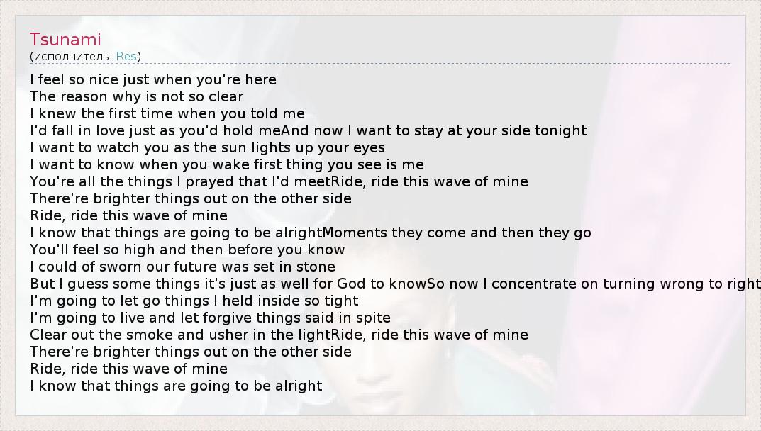 I feel so nice just when you're here The reason why is not so clear I knew the first time when you told me I'd fall in love just as you'd hold meAnd now I want to stay at your side tonight I want to watch you as the sun lights up your eyes I want to know when you wake first thing you see is me You're all the things I prayed that I'd meetRide, ride this wave of mine There're brighter things out on the other side Ride, ride this wave of mine I know that things are going to be alrightMoments they come and then they go You'll feel so high and then before you know I could of sworn our future was set in stone But I guess some things it's just as well for God to knowSo now I concentrate on turning wrong to right I'm going to let go things I held inside so tight I'm going to live and let forgive things said in spite Clear out the smoke and usher in the lightRide, ride this wave of mine There're brighter things out on the other side Ride, ride this wave of mine I know that things are going to be alright