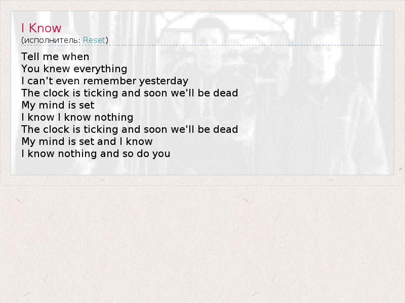 Tell me when You knew everything I can't even remember yesterday The clock is ticking and soon we'll be dead My mind is set I know I know nothing The clock is ticking and soon we'll be dead My mind is set and I know I know nothing and so do you