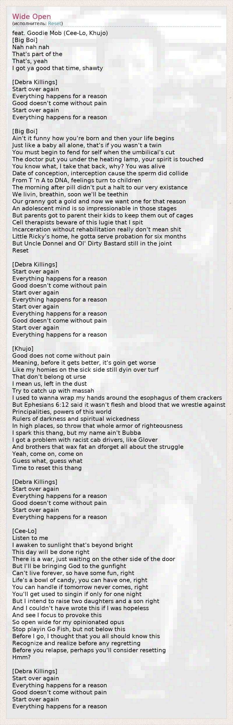 feat. Goodie Mob (Cee-Lo, Khujo) [Big Boi] Nah nah nah That's part of the That's, yeah I got ya good that time, shawty [Debra Killings] Start over again Everything happens for a reason Good doesn't come without pain Start over again Everything happens for a reason [Big Boi] Ain't it funny how you're born and then your life begins Just like a baby all alone, that's if you wasn't a twin You must begin to fend for self when the umbilical's cut The doctor put you under the heating lamp, your spirit is touched You know what, I take that back, why? You was alive Date of conception, interception cause the sperm did collide From T 'n A to DNA, feelings turn to children The morning after pill didn't put a halt to our very existance We livin, breathin, soon we'll be teethin Our granny got a gold and now we want one for that reason An adolescent mind is so impressionable in those stages But parents got to parent their kids to keep them out of cages Cell therapists beware of this lugie that I spit Incarceration without rehabilitation really don't mean shit Little Ricky's home, he gotta serve probation for six months But Uncle Donnel and Ol' Dirty Bastard still in the joint Reset [Debra Killings] Start over again Everything happens for a reason Good doesn't come without pain Start over again Everything happens for a reason Start over again Everything happens for a reason Good doesn't come without pain Start over again Everything happens for a reason [Khujo] Good does not come without pain Meaning, before it gets better, it's goin get worse Like my homies on the sick side still dyin over turf That don't belong ot urse I mean us, left in the dust Try to catch up with massah I used to wanna wrap my hands around the esophagus of them crackers But Ephesians 6:12 said it wasn't flesh and blood that we wrestle against Principalities, powers of this world Rulers of darkness and spiritual wickedness In high places, so throw that whole armor of righteousness I spark this thang, but my name ain't Bubba I got a problem with racist cab drivers, like Glover And brothers that wax fat an dforget all about the struggle Yeah, come on, come on Guess what, guess what Time to reset this thang [Debra Killings] Start over again Everything happens for a reason Good doesn't come without pain Start over again Everything happens for a reason [Cee-Lo] Listen to me I awaken to sunlight that's beyond bright This day will be done right There is a war, just waiting on the other side of the door But I'll be bringing God to the gunfight Can't live forever, so have some fun, right Life's a bowl of candy, you can have one, right You can handle if tomorrow never comes, right You'll get used to singin if only for one night But I intend to raise two daughters and a son right And I couldn't have wrote this if I was hopeless And see I focus to provoke this So open wide for my opinionated opus Stop playin Go Fish, but not below this Before I go, I thought that you all should know this Recognize and realize before any regretting Before you relapse, perhaps you'll consider resetting Hmm? [Debra Killings] Start over again Everything happens for a reason Good doesn't come without pain Start over again Everything happens for a reason