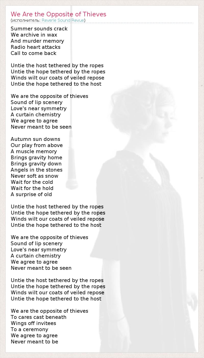 Summer sounds crack We archive in wax And murder memory Radio heart attacks Call to come back Untie the host tethered by the ropes Untie the hope tethered by the ropes Winds wilt our coats of veiled repose Untie the hope tethered to the host We are the opposite of thieves Sound of lip scenery Love's near symmetry A curtain chemistry We agree to agree Never meant to be seen Autumn sun downs Our play from above A muscle memory Brings gravity home Brings gravity down Angels in the stones Never soft as snow Wait for the cold Wait for the hold A surprise of old Untie the host tethered by the ropes Untie the hope tethered by the ropes Winds wilt our coats of veiled repose Untie the hope tethered to the host We are the opposite of thieves Sound of lip scenery Love's near symmetry A curtain chemistry We agree to agree Never meant to be seen Untie the host tethered by the ropes Untie the hope tethered by the ropes Winds wilt our coats of veiled repose Untie the hope tethered to the host We are the opposite of thieves To cares cast beneath Wings off invitees To a ceremony We agree to agree Never meant to be
