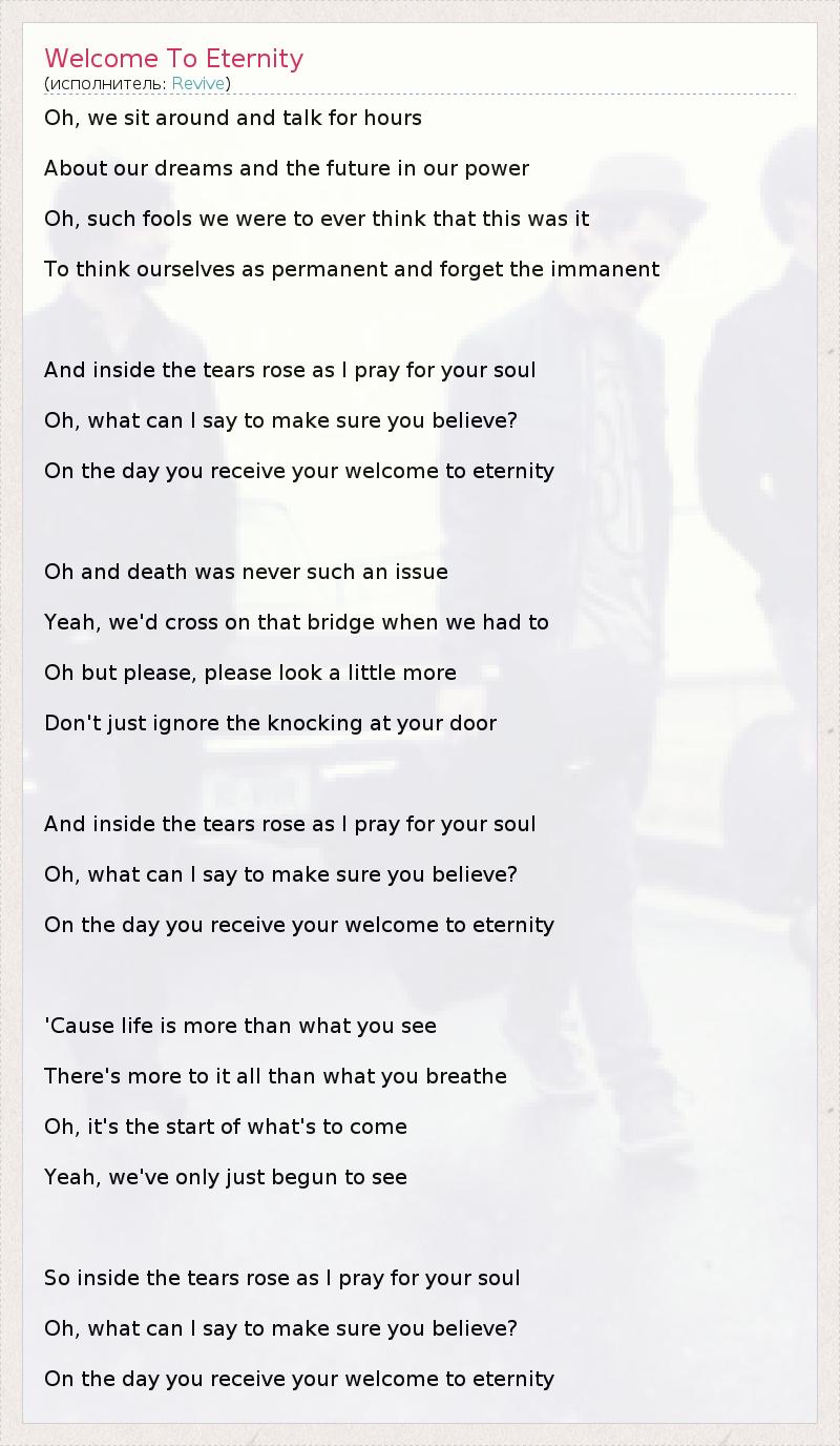 Oh, we sit around and talk for hours About our dreams and the future in our power Oh, such fools we were to ever think that this was it To think ourselves as permanent and forget the immanent And inside the tears rose as I pray for your soul Oh, what can I say to make sure you believe? On the day you receive your welcome to eternity Oh and death was never such an issue Yeah, we'd cross on that bridge when we had to Oh but please, please look a little more Don't just ignore the knocking at your door And inside the tears rose as I pray for your soul Oh, what can I say to make sure you believe? On the day you receive your welcome to eternity 'Cause life is more than what you see There's more to it all than what you breathe Oh, it's the start of what's to come Yeah, we've only just begun to see So inside the tears rose as I pray for your soul Oh, what can I say to make sure you believe? On the day you receive your welcome to eternity