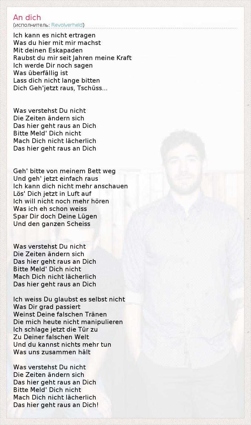 Это интересно:Revolverheld - немецкая рок-группа. Состав группы: Йоханнес Штрате (Вокал), Кристофер Хюнеке (гитара/бэк-вокал), Нильс Грёч (гитара/бэк-вокал), Якоб Зинн (ударные) и Флориан Шпейер (бас-гитара). Группа была основана в Гамбурге в 2003 году. Изначально группа носила название "Manga". Позже в 2004 году группа решила сменить название на "Revolverheld". В 2006 году группа приняла участие в музыкальном конкурсе... продолжение
