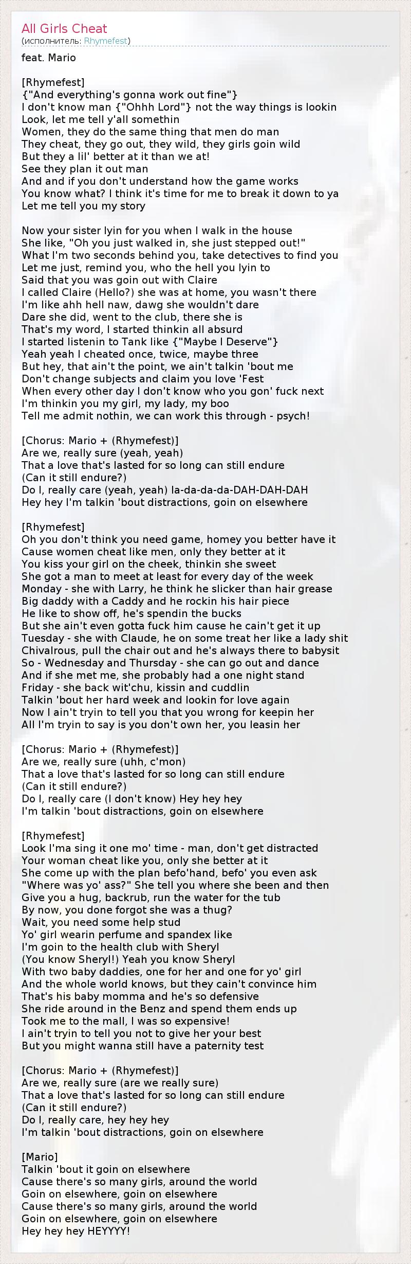А как ты думаешь, о чем песня "All Girls Cheat" ?