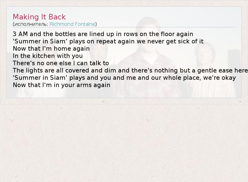 3 AM and the bottles are lined up in rows on the floor again 'Summer in Siam' plays on repeat again we never get sick of it Now that I'm home again In the kitchen with you There's no one else I can talk to The lights are all covered and dim and there's nothing but a gentle ease here 'Summer in Siam' plays and you and me and our whole place, we're okay Now that I'm in your arms again
