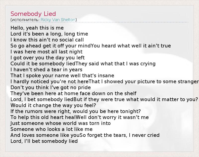 Hello, yeah this is me Lord it's been a long, long time I know this ain't no social call So go ahead get it off your mindYou heard what well it ain't true I was here most all last night I got over you the day you left Could it be somebody liedThey said what that I was crying I haven't shed a tear in years That I spoke your name well that's insane I hardly noticed you're not hereThat I showed your picture to some stranger Don't you think I've got no pride They've been here at home face down on the shelf Lord, I bet somebody liedBut if they were true what would it matter to you? Would it change the way you feel? If the rumors were right, would you be here tonight? To help this old heart healWell don't worry it wasn't me Just someone whose world was torn into Someone who looks a lot like me And loves someone like youSo forget the tears, I never cried Lord, I'll bet somebody lied