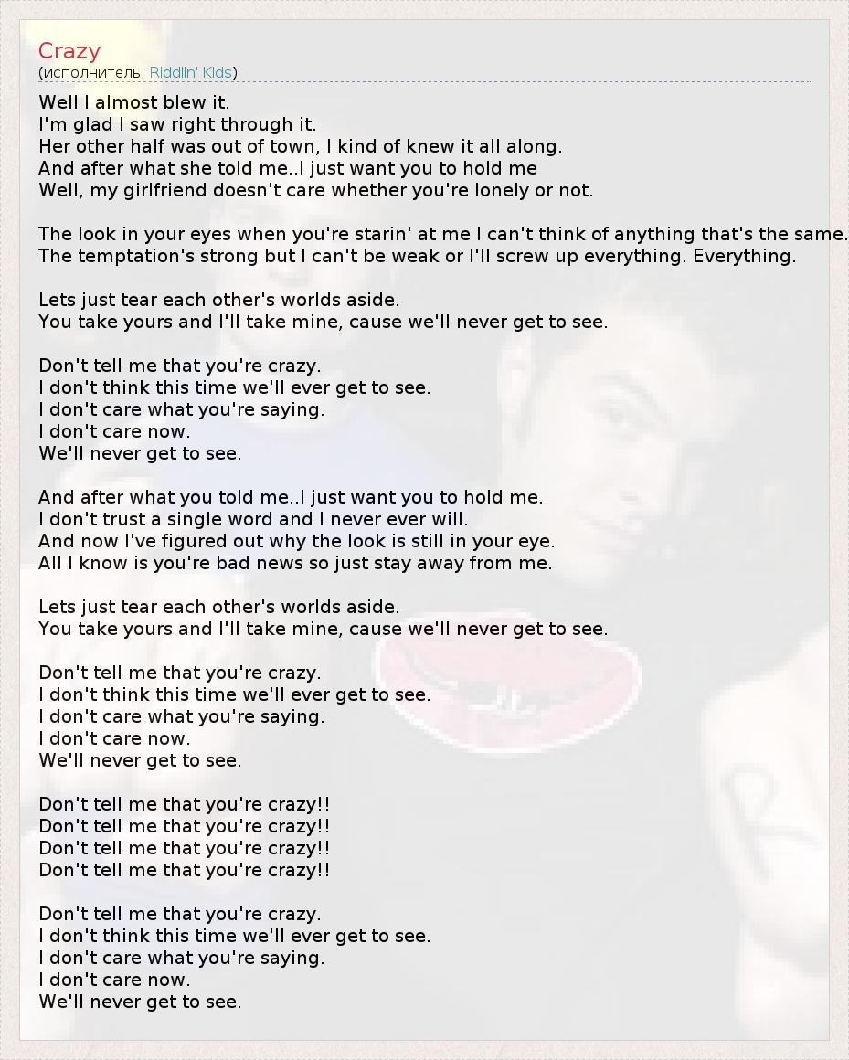 Well I almost blew it. I'm glad I saw right through it. Her other half was out of town, I kind of knew it all along. And after what she told me..I just want you to hold me Well, my girlfriend doesn't care whether you're lonely or not. The look in your eyes when you're starin' at me I can't think of anything that's the same. The temptation's strong but I can't be weak or I'll screw up everything. Everything. Lets just tear each other's worlds aside. You take yours and I'll take mine, cause we'll never get to see. Don't tell me that you're crazy. I don't think this time we'll ever get to see. I don't care what you're saying. I don't care now. We'll never get to see. And after what you told me..I just want you to hold me. I don't trust a single word and I never ever will. And now I've figured out why the look is still in your eye. All I know is you're bad news so just stay away from me. Lets just tear each other's worlds aside. You take yours and I'll take mine, cause we'll never get to see. Don't tell me that you're crazy. I don't think this time we'll ever get to see. I don't care what you're saying. I don't care now. We'll never get to see. Don't tell me that you're crazy!! Don't tell me that you're crazy!! Don't tell me that you're crazy!! Don't tell me that you're crazy!! Don't tell me that you're crazy. I don't think this time we'll ever get to see. I don't care what you're saying. I don't care now. We'll never get to see.