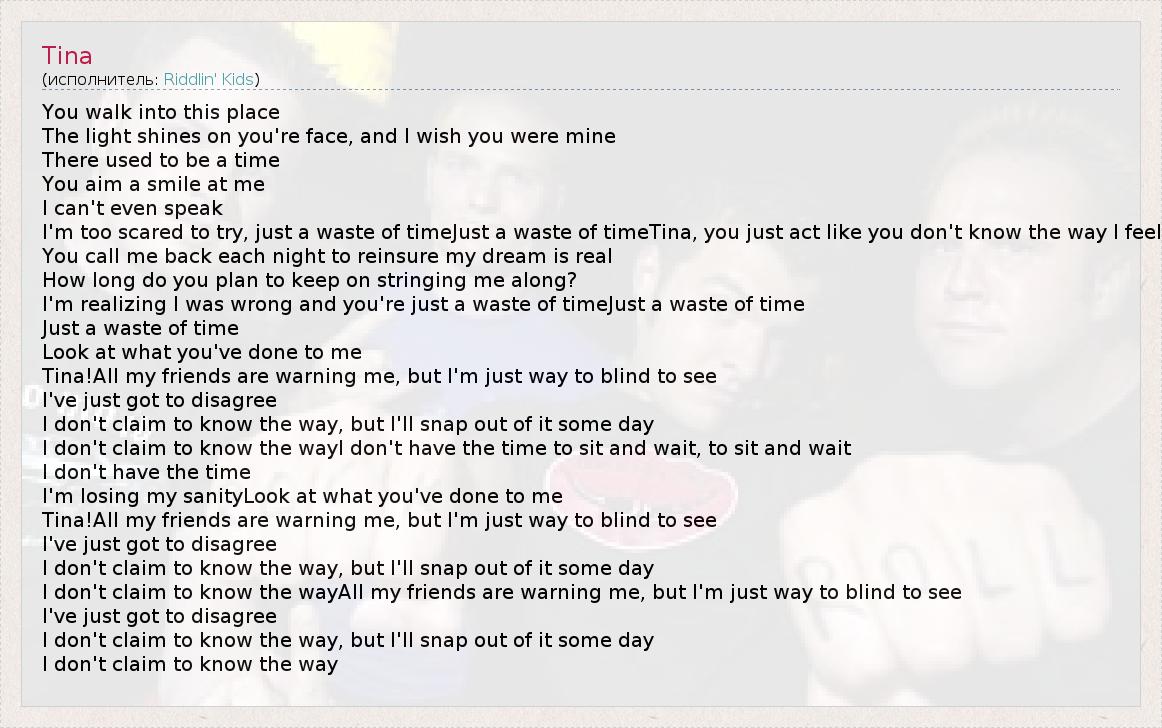 You walk into this place The light shines on you're face, and I wish you were mine There used to be a time You aim a smile at me I can't even speak I'm too scared to try, just a waste of timeJust a waste of timeTina, you just act like you don't know the way I feel You call me back each night to reinsure my dream is real How long do you plan to keep on stringing me along? I'm realizing I was wrong and you're just a waste of timeJust a waste of time Just a waste of time Look at what you've done to me Tina!All my friends are warning me, but I'm just way to blind to see I've just got to disagree I don't claim to know the way, but I'll snap out of it some day I don't claim to know the wayI don't have the time to sit and wait, to sit and wait I don't have the time I'm losing my sanityLook at what you've done to me Tina!All my friends are warning me, but I'm just way to blind to see I've just got to disagree I don't claim to know the way, but I'll snap out of it some day I don't claim to know the wayAll my friends are warning me, but I'm just way to blind to see I've just got to disagree I don't claim to know the way, but I'll snap out of it some day I don't claim to know the way