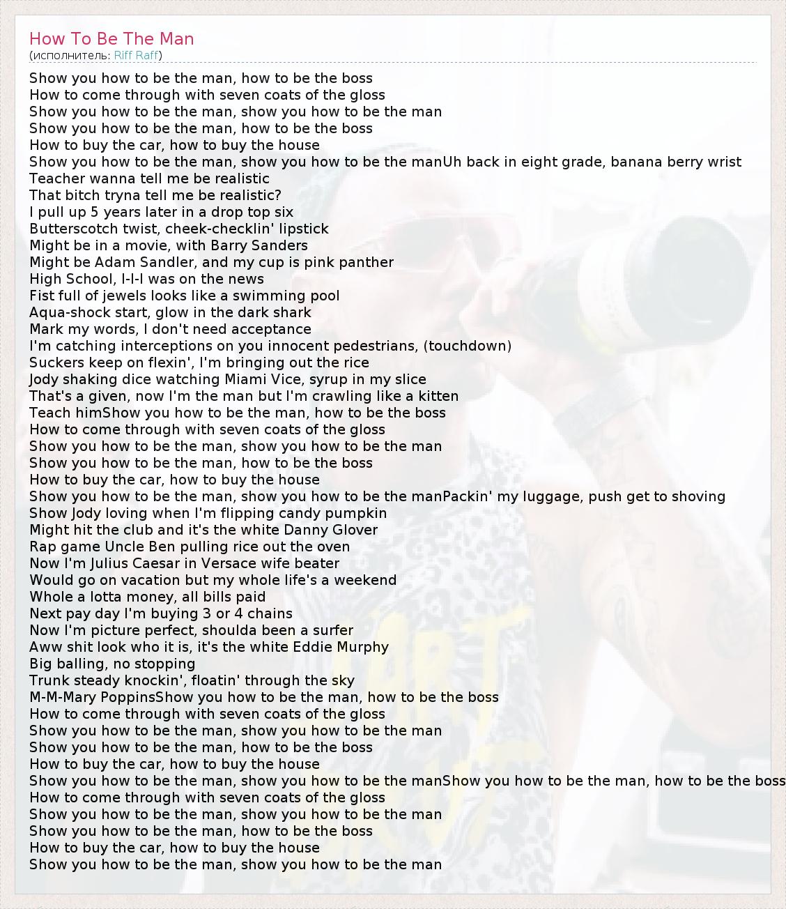 Show you how to be the man, how to be the boss How to come through with seven coats of the gloss Show you how to be the man, show you how to be the man Show you how to be the man, how to be the boss How to buy the car, how to buy the house Show you how to be the man, show you how to be the manUh back in eight grade, banana berry wrist Teacher wanna tell me be realistic That bitch tryna tell me be realistic? I pull up 5 years later in a drop top six Butterscotch twist, cheek-checklin' lipstick Might be in a movie, with Barry Sanders Might be Adam Sandler, and my cup is pink panther High School, I-I-I was on the news Fist full of jewels looks like a swimming pool Aqua-shock start, glow in the dark shark Mark my words, I don't need acceptance I'm catching interceptions on you innocent pedestrians, (touchdown) Suckers keep on flexin', I'm bringing out the rice Jody shaking dice watching Miami Vice, syrup in my slice That's a given, now I'm the man but I'm crawling like a kitten Teach himShow you how to be the man, how to be the boss How to come through with seven coats of the gloss Show you how to be the man, show you how to be the man Show you how to be the man, how to be the boss How to buy the car, how to buy the house Show you how to be the man, show you how to be the manPackin' my luggage, push get to shoving Show Jody loving when I'm flipping candy pumpkin Might hit the club and it's the white Danny Glover Rap game Uncle Ben pulling rice out the oven Now I'm Julius Caesar in Versace wife beater Would go on vacation but my whole life's a weekend Whole a lotta money, all bills paid Next pay day I'm buying 3 or 4 chains Now I'm picture perfect, shoulda been a surfer Aww shit look who it is, it's the white Eddie Murphy Big balling, no stopping Trunk steady knockin', floatin' through the sky M-M-Mary PoppinsShow you how to be the man, how to be the boss How to come through with seven coats of the gloss Show you how to be the man, show you how to be the man Show you how to be the man, how to be the boss How to buy the car, how to buy the house Show you how to be the man, show you how to be the manShow you how to be the man, how to be the boss How to come through with seven coats of the gloss Show you how to be the man, show you how to be the man Show you how to be the man, how to be the boss How to buy the car, how to buy the house Show you how to be the man, show you how to be the man