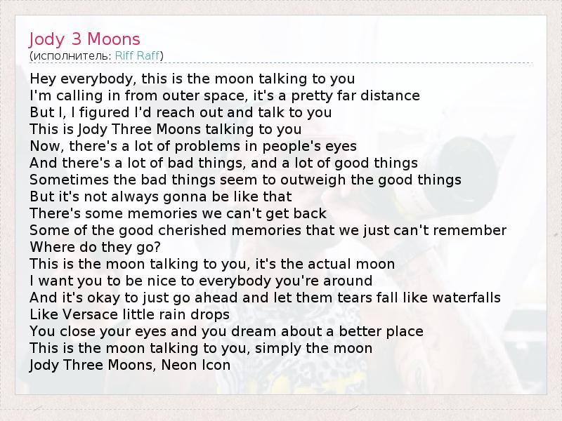 А как ты думаешь, о чем песня "Jody 3 Moons" ?