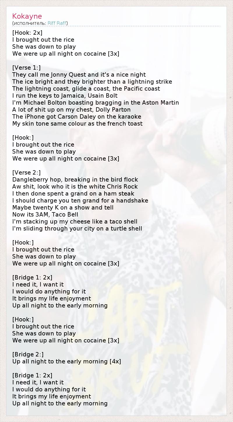 [Hook: 2x] I brought out the rice She was down to play We were up all night on cocaine [3x] [Verse 1:] They call me Jonny Quest and it's a nice night The ice bright and they brighter than a lightning strike The lightning coast, glide a coast, the Pacific coast I run the keys to Jamaica, Usain Bolt I'm Michael Bolton boasting bragging in the Aston Martin A lot of shit up on my chest, Dolly Parton The iPhone got Carson Daley on the karaoke My skin tone same colour as the french toast [Hook:] I brought out the rice She was down to play We were up all night on cocaine [3x] [Verse 2:] Dangleberry hop, breaking in the bird flock Aw shit, look who it is the white Chris Rock I then done spent a grand on a ham steak I should charge you ten grand for a handshake Maybe twenty K on a show and tell Now its 3AM, Taco Bell I'm stacking up my cheese like a taco shell I'm sliding through your city on a turtle shell [Hook:] I brought out the rice She was down to play We were up all night on cocaine [3x] [Bridge 1: 2x] I need it, I want it I would do anything for it It brings my life enjoyment Up all night to the early morning [Hook:] I brought out the rice She was down to play We were up all night on cocaine [3x] [Bridge 2:] Up all night to the early morning [4x] [Bridge 1: 2x] I need it, I want it I would do anything for it It brings my life enjoyment Up all night to the early morning