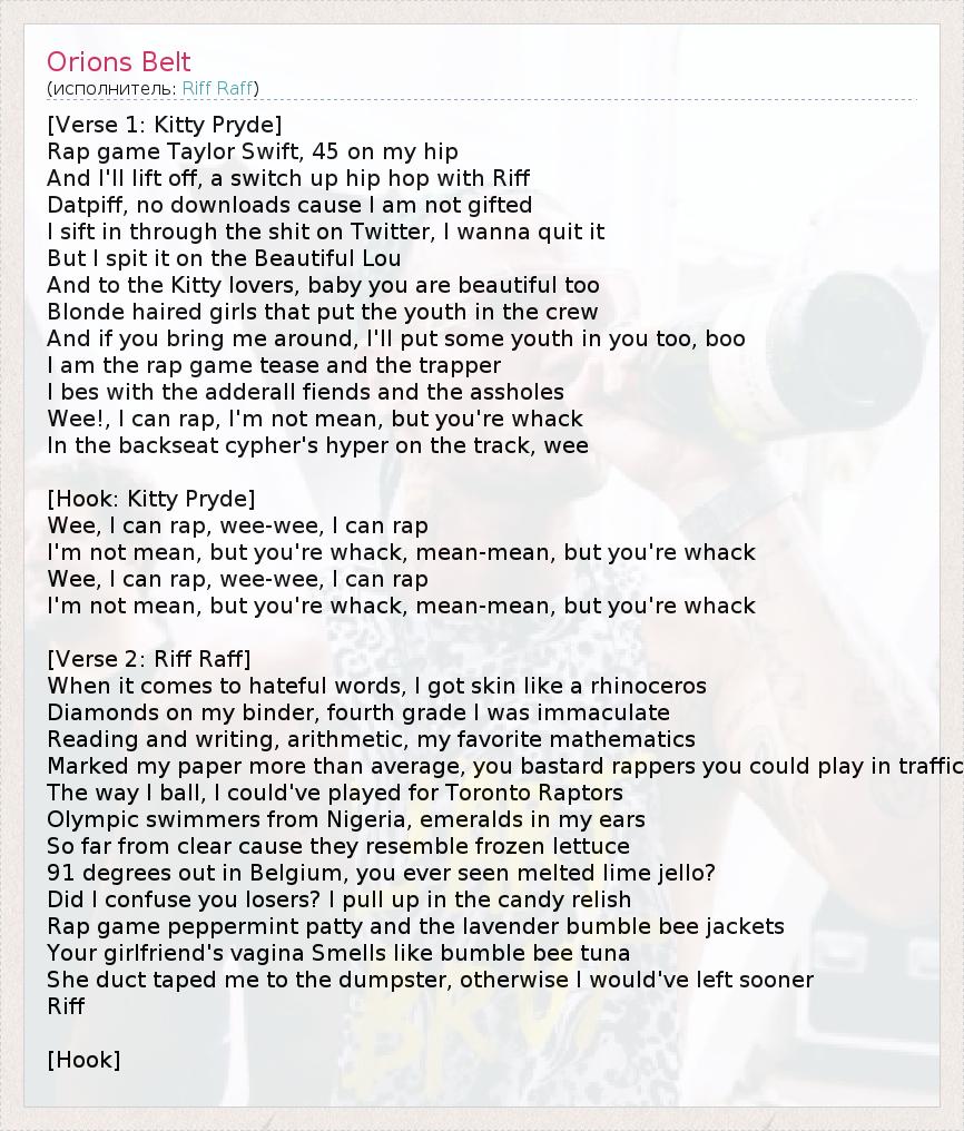 [Verse 1: Kitty Pryde] Rap game Taylor Swift, 45 on my hip And I'll lift off, a switch up hip hop with Riff Datpiff, no downloads cause I am not gifted I sift in through the shit on Twitter, I wanna quit it But I spit it on the Beautiful Lou And to the Kitty lovers, baby you are beautiful too Blonde haired girls that put the youth in the crew And if you bring me around, I'll put some youth in you too, boo I am the rap game tease and the trapper I bes with the adderall fiends and the assholes Wee!, I can rap, I'm not mean, but you're whack In the backseat cypher's hyper on the track, wee [Hook: Kitty Pryde] Wee, I can rap, wee-wee, I can rap I'm not mean, but you're whack, mean-mean, but you're whack Wee, I can rap, wee-wee, I can rap I'm not mean, but you're whack, mean-mean, but you're whack [Verse 2: Riff Raff] When it comes to hateful words, I got skin like a rhinoceros Diamonds on my binder, fourth grade I was immaculate Reading and writing, arithmetic, my favorite mathematics Marked my paper more than average, you bastard rappers you could play in traffic The way I ball, I could've played for Toronto Raptors Olympic swimmers from Nigeria, emeralds in my ears So far from clear cause they resemble frozen lettuce 91 degrees out in Belgium, you ever seen melted lime jello? Did I confuse you losers? I pull up in the candy relish Rap game peppermint patty and the lavender bumble bee jackets Your girlfriend's vagina Smells like bumble bee tuna She duct taped me to the dumpster, otherwise I would've left sooner Riff [Hook]