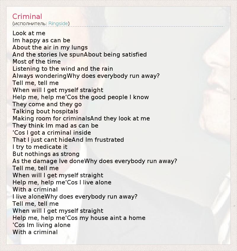 Look at me Im happy as can be About the air in my lungs And the stories Ive spunAbout being satisfied Most of the time Listening to the wind and the rain Always wonderingWhy does everybody run away? Tell me, tell me When will I get myself straight Help me, help me'Cos the good people I know They come and they go Talking bout hospitals Making room for criminalsAnd they look at me They think Im mad as can be 'Cos I got a criminal inside That I just cant hideAnd Im frustrated I try to medicate it But nothings as strong As the damage Ive doneWhy does everybody run away? Tell me, tell me When will I get myself straight Help me, help me'Cos I live alone With a criminal I live aloneWhy does everybody run away? Tell me, tell me When will I get myself straight Help me, help me'Cos my house aint a home 'Cos Im living alone With a criminal