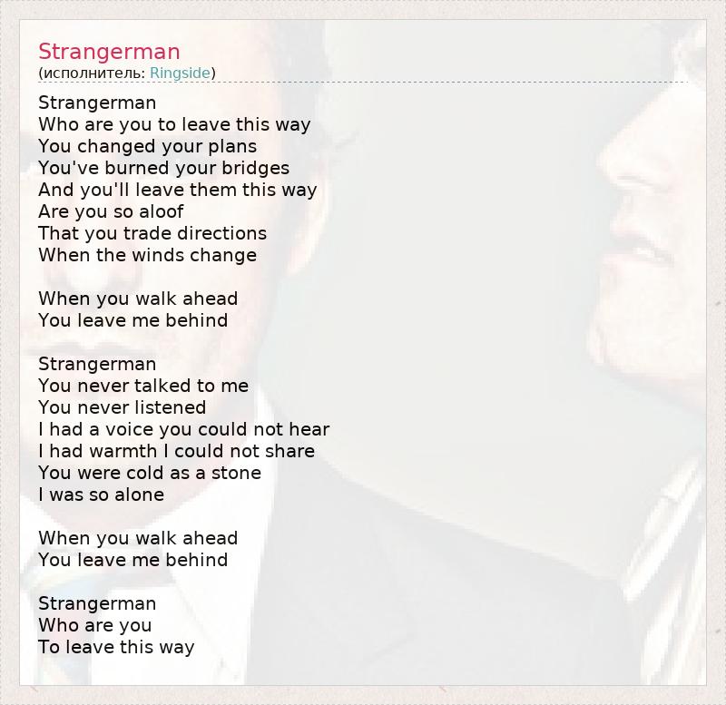 Strangerman Who are you to leave this way You changed your plans You've burned your bridges And you'll leave them this way Are you so aloof That you trade directions When the winds change When you walk ahead You leave me behind Strangerman You never talked to me You never listened I had a voice you could not hear I had warmth I could not share You were cold as a stone I was so alone When you walk ahead You leave me behind Strangerman Who are you To leave this way