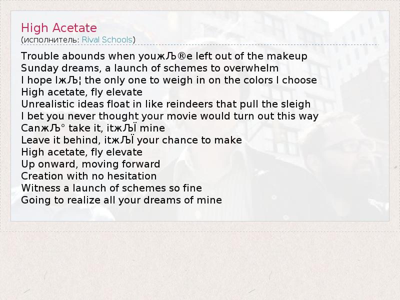Trouble abounds when youжЉ®e left out of the makeup Sunday dreams, a launch of schemes to overwhelm I hope IжЉ¦ the only one to weigh in on the colors I choose High acetate, fly elevate Unrealistic ideas float in like reindeers that pull the sleigh I bet you never thought your movie would turn out this way CanжЉ° take it, itжЉЇ mine Leave it behind, itжЉЇ your chance to make High acetate, fly elevate Up onward, moving forward Creation with no hesitation Witness a launch of schemes so fine Going to realize all your dreams of mine