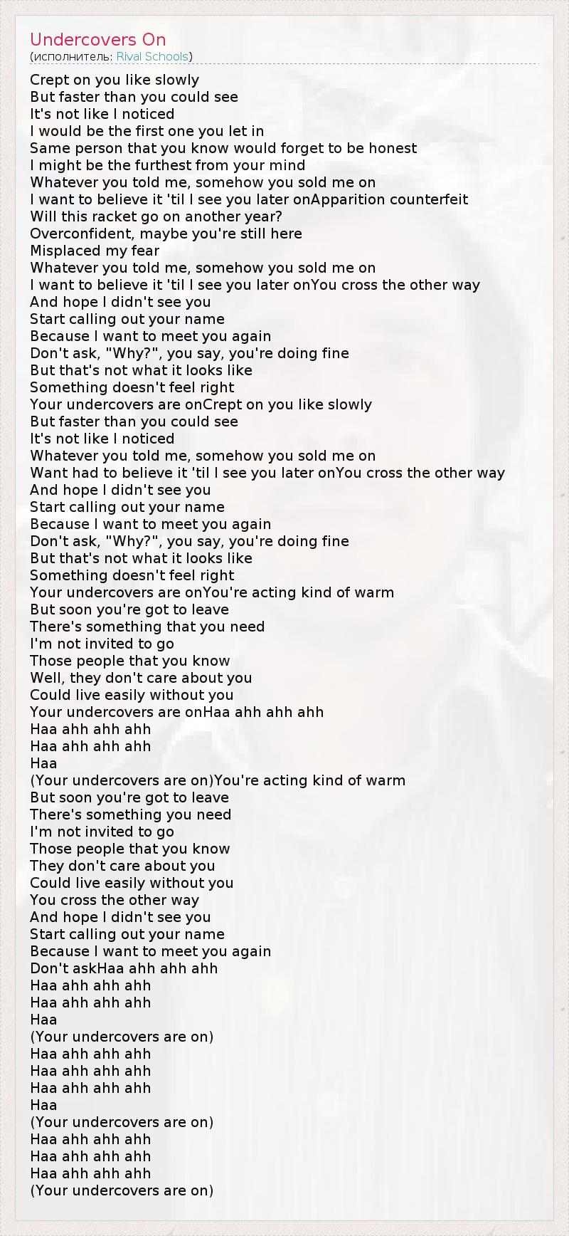Crept on you like slowly But faster than you could see It's not like I noticed I would be the first one you let in Same person that you know would forget to be honest I might be the furthest from your mind Whatever you told me, somehow you sold me on I want to believe it 'til I see you later onApparition counterfeit Will this racket go on another year? Overconfident, maybe you're still here Misplaced my fear Whatever you told me, somehow you sold me on I want to believe it 'til I see you later onYou cross the other way And hope I didn't see you Start calling out your name Because I want to meet you again Don't ask, "Why?", you say, you're doing fine But that's not what it looks like Something doesn't feel right Your undercovers are onCrept on you like slowly But faster than you could see It's not like I noticed Whatever you told me, somehow you sold me on Want had to believe it 'til I see you later onYou cross the other way And hope I didn't see you Start calling out your name Because I want to meet you again Don't ask, "Why?", you say, you're doing fine But that's not what it looks like Something doesn't feel right Your undercovers are onYou're acting kind of warm But soon you're got to leave There's something that you need I'm not invited to go Those people that you know Well, they don't care about you Could live easily without you Your undercovers are onHaa ahh ahh ahh Haa ahh ahh ahh Haa ahh ahh ahh Haa (Your undercovers are on)You're acting kind of warm But soon you're got to leave There's something you need I'm not invited to go Those people that you know They don't care about you Could live easily without you You cross the other way And hope I didn't see you Start calling out your name Because I want to meet you again Don't askHaa ahh ahh ahh Haa ahh ahh ahh Haa ahh ahh ahh Haa (Your undercovers are on) Haa ahh ahh ahh Haa ahh ahh ahh Haa ahh ahh ahh Haa (Your undercovers are on) Haa ahh ahh ahh Haa ahh ahh ahh Haa ahh ahh ahh (Your undercovers are on)