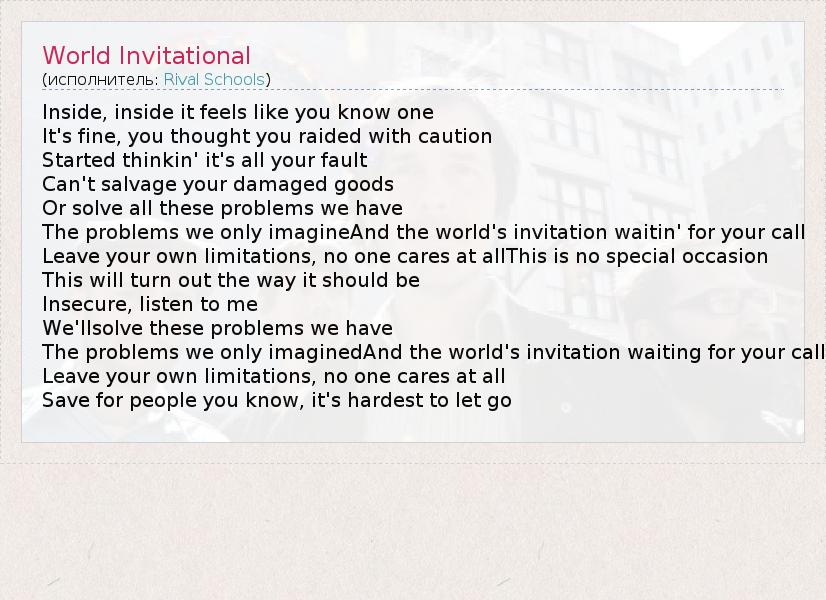 А как ты думаешь, о чем песня "World Invitational" ?