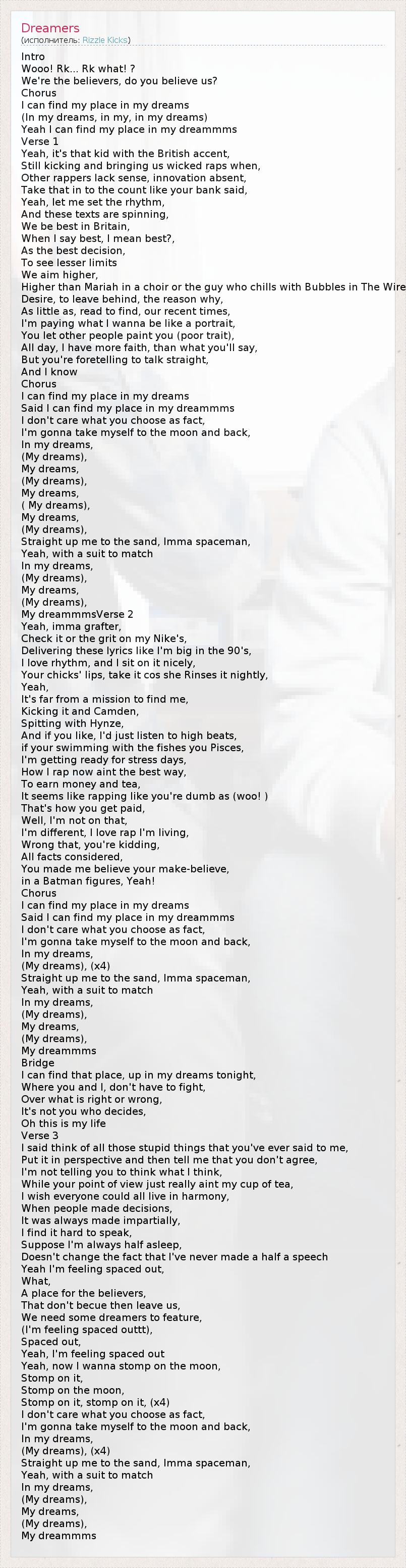 Это интересно:Rizzle Kicks — молодой хип хоп дуэт из Англии. Формально их группа появилась примерно в 1996 году, когда Джордан и Харли целыми днями играли на заднем дворе, будучи еще совсем детьми. Спустя 8 лет, после переезда в Брайтон, они снова встретились, а еще через 4 года — вместе закончили один колледж.Вскоре мальчики поняли насколько хорошо сочетаются их стили и официально стали называть себя Rizzle... продолжение