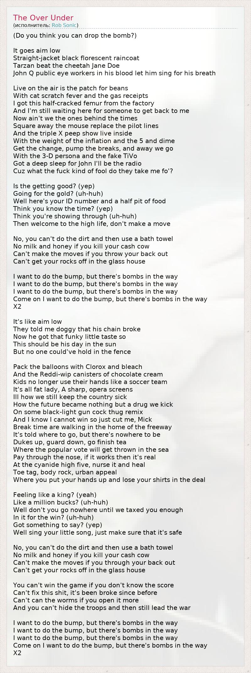 (Do you think you can drop the bomb?) It goes aim low Straight-jacket black florescent raincoat Tarzan beat the cheetah Jane Doe John Q public eye workers in his blood let him sing for his breath Live on the air is the patch for beans With cat scratch fever and the gas receipts I got this half-cracked femur from the factory And I'm still waiting here for someone to get back to me Now ain't we the ones behind the times Square away the mouse replace the pilot lines And the triple X peep show live inside With the weight of the inflation and the 5 and dime Get the change, pump the breaks, and away we go With the 3-D persona and the fake TiVo Got a deep sleep for John I'll be the radio Cuz what the fuck kind of fool do they take me fo'? Is the getting good? (yep) Going for the gold? (uh-huh) Well here's your ID number and a half pit of food Think you know the time? (yep) Think you're showing through (uh-huh) Then welcome to the high life, don't make a move No, you can't do the dirt and then use a bath towel No milk and honey if you kill your cash cow Can't make the moves if you throw your back out Can't get your rocks off in the glass house I want to do the bump, but there's bombs in the way I want to do the bump, but there's bombs in the way I want to do the bump, but there's bombs in the way Come on I want to do the bump, but there's bombs in the way X2 It's like aim low They told me doggy that his chain broke Now he got that funky little taste so This should be his day in the sun But no one could've hold in the fence Pack the balloons with Clorox and bleach And the Reddi-wip canisters of chocolate cream Kids no longer use their hands like a soccer team It's all fat lady, A sharp, opera screens Ill how we still keep the country sick How the future became nothing but a drug we kick On some black-light gun cock thug remix And I know I cannot win so just cut me, Mick Break time are walking in the home of the freeway It's told where to go, but there's nowhere to be Dukes up, guard down, go finish tea Where the popular vote will get thrown in the sea Pay through the nose, if it works then it's real At the cyanide high five, nurse it and heal Toe tag, body rock, urban appeal Where you put your hands up and lose your shirts in the deal Feeling like a king? (yeah) Like a million bucks? (uh-huh) Well don't you go nowhere until we taxed you enough In it for the win? (uh-huh) Got something to say? (yep) Well sing your little song, just make sure that it's safe No, you can't do the dirt and then use a bath towel No milk and honey if you kill your cash cow Can't make the moves if you through your back out Can't get your rocks off in the glass house You can't win the game if you don't know the score Can't fix this shit, it's been broke since before Can't can the worms if you open it more And you can't hide the troops and then still lead the war I want to do the bump, but there's bombs in the way I want to do the bump, but there's bombs in the way I want to do the bump, but there's bombs in the way Come on I want to do the bump, but there's bombs in the way X2