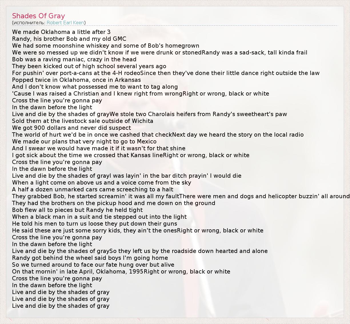 We made Oklahoma a little after 3 Randy, his brother Bob and my old GMC We had some moonshine whiskey and some of Bob's homegrown We were so messed up we didn't know if we were drunk or stonedRandy was a sad-sack, tall kinda frail Bob was a raving maniac, crazy in the head They been kicked out of high school several years ago For pushin' over port-a-cans at the 4-H rodeoSince then they've done their little dance right outside the law Popped twice in Oklahoma, once in Arkansas And I don't know what possessed me to want to tag along 'Cause I was raised a Christian and I knew right from wrongRight or wrong, black or white Cross the line you're gonna pay In the dawn before the light Live and die by the shades of grayWe stole two Charolais heifers from Randy's sweetheart's paw Sold them at the livestock sale outside of Wichita We got 900 dollars and never did suspect The world of hurt we'd be in once we cashed that checkNext day we heard the story on the local radio We made our plans that very night to go to Mexico And I swear we would have made it if it wasn't for that shine I got sick about the time we crossed that Kansas lineRight or wrong, black or white Cross the line you're gonna pay In the dawn before the light Live and die by the shades of grayI was layin' in the bar ditch prayin' I would die When a light come on above us and a voice come from the sky A half a dozen unmarked cars came screeching to a halt They grabbed Bob, he started screamin' it was all my faultThere were men and dogs and helicopter buzzin' all around They had the brothers on the pickup hood and me down on the ground Bob flew all to pieces but Randy he held tight When a black man in a suit and tie stepped out into the light He told his men to turn us loose they put down their guns He said these are just some sorry kids, they ain't the onesRight or wrong, black or white Cross the line you're gonna pay In the dawn before the light Live and die by the shades of graySo they left us by the roadside down hearted and alone Randy got behind the wheel said boys I'm going home So we turned around to face our fate hung over but alive On that mornin' in late April, Oklahoma, 1995Right or wrong, black or white Cross the line you're gonna pay In the dawn before the light Live and die by the shades of gray Live and die by the shades of gray Live and die by the shades of gray