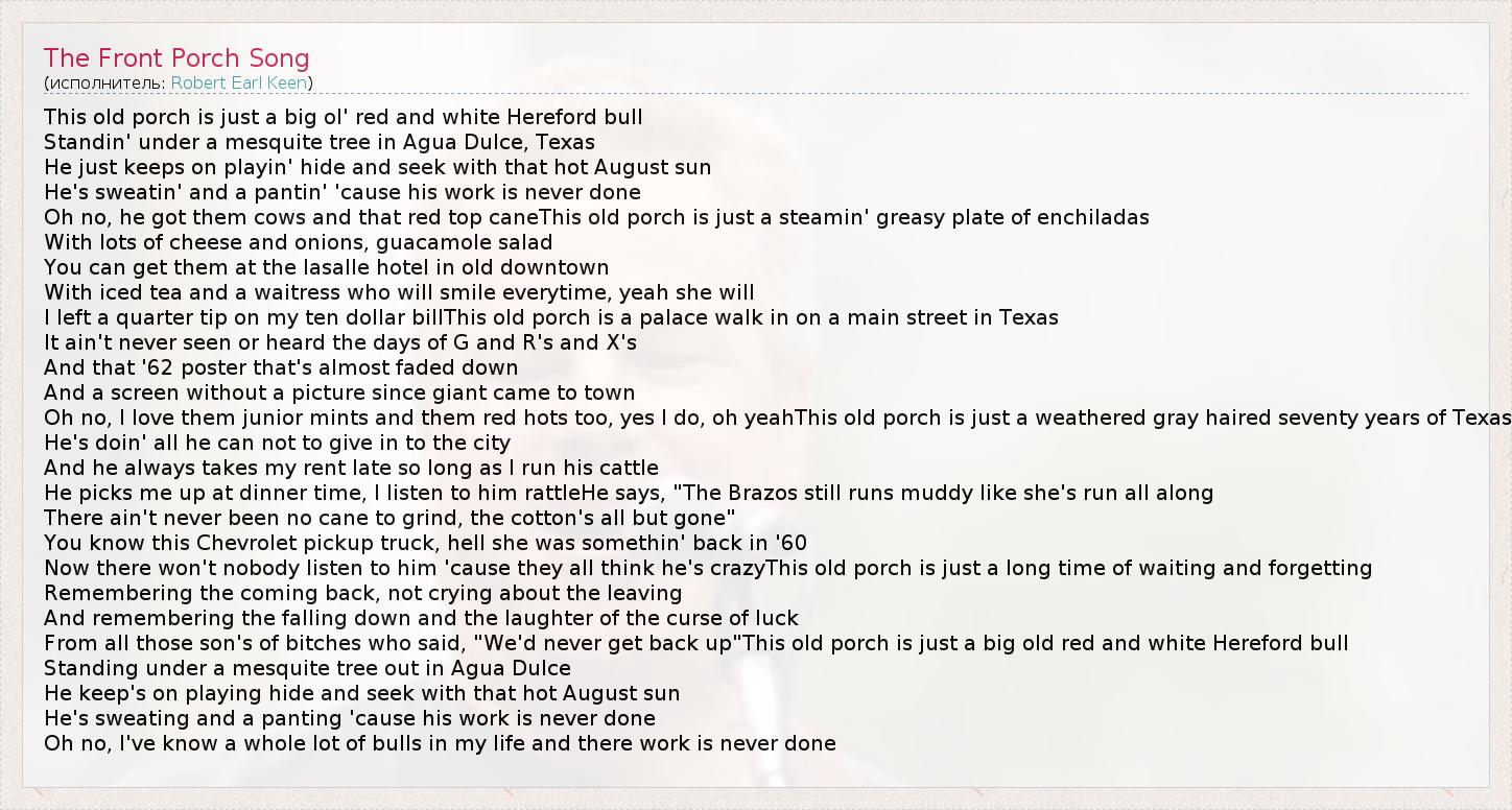 This old porch is just a big ol' red and white Hereford bull Standin' under a mesquite tree in Agua Dulce, Texas He just keeps on playin' hide and seek with that hot August sun He's sweatin' and a pantin' 'cause his work is never done Oh no, he got them cows and that red top caneThis old porch is just a steamin' greasy plate of enchiladas With lots of cheese and onions, guacamole salad You can get them at the lasalle hotel in old downtown With iced tea and a waitress who will smile everytime, yeah she will I left a quarter tip on my ten dollar billThis old porch is a palace walk in on a main street in Texas It ain't never seen or heard the days of G and R's and X's And that '62 poster that's almost faded down And a screen without a picture since giant came to town Oh no, I love them junior mints and them red hots too, yes I do, oh yeahThis old porch is just a weathered gray haired seventy years of Texas He's doin' all he can not to give in to the city And he always takes my rent late so long as I run his cattle He picks me up at dinner time, I listen to him rattleHe says, "The Brazos still runs muddy like she's run all along There ain't never been no cane to grind, the cotton's all but gone" You know this Chevrolet pickup truck, hell she was somethin' back in '60 Now there won't nobody listen to him 'cause they all think he's crazyThis old porch is just a long time of waiting and forgetting Remembering the coming back, not crying about the leaving And remembering the falling down and the laughter of the curse of luck From all those son's of bitches who said, "We'd never get back up"This old porch is just a big old red and white Hereford bull Standing under a mesquite tree out in Agua Dulce He keep's on playing hide and seek with that hot August sun He's sweating and a panting 'cause his work is never done Oh no, I've know a whole lot of bulls in my life and there work is never done