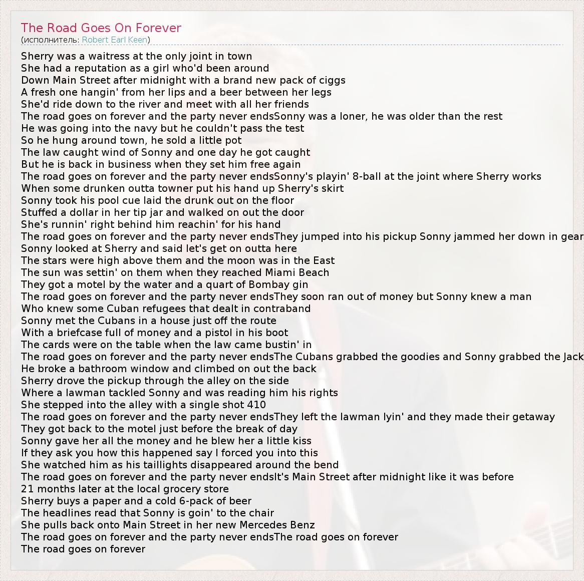 А как ты думаешь, о чем песня "The Road Goes On Forever" ?