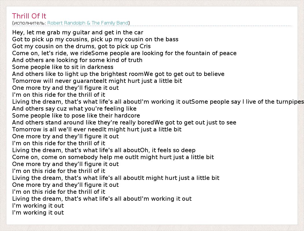 Hey, let me grab my guitar and get in the car Got to pick up my cousins, pick up my cousin on the bass Got my cousin on the drums, got to pick up Cris Come on, let's ride, we rideSome people are looking for the fountain of peace And others are looking for some kind of truth Some people like to sit in darkness And others like to light up the brightest roomWe got to get out to believe Tomorrow will never guaranteeIt might hurt just a little bit One more try and they'll figure it out I'm on this ride for the thrill of it Living the dream, that's what life's all aboutI'm working it outSome people say I live of the turnpipes And others say cuz what you're feeling like Some people like to pose like their hardcore And others stand around like they're really boredWe got to get out just to see Tomorrow is all we'll ever needIt might hurt just a little bit One more try and they'll figure it out I'm on this ride for the thrill of it Living the dream, that's what life's all aboutOh, it feels so deep Come on, come on somebody help me outIt might hurt just a little bit One more try and they'll figure it out I'm on this ride for the thrill of it Living the dream, that's what life's all aboutIt might hurt just a little bit One more try and they'll figure it out I'm on this ride for the thrill of it Living the dream, that's what life's all aboutI'm working it out I'm working it out I'm working it out