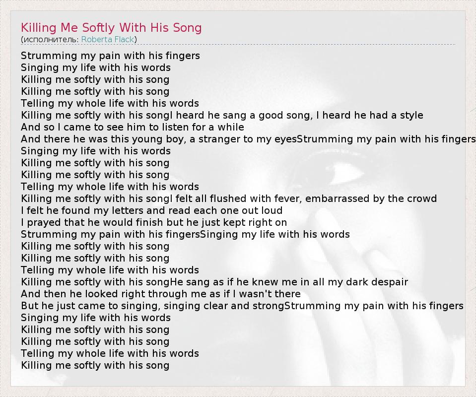 Strumming my pain with his fingers Singing my life with his words Killing me softly with his song Killing me softly with his song Telling my whole life with his words Killing me softly with his songI heard he sang a good song, I heard he had a style And so I came to see him to listen for a while And there he was this young boy, a stranger to my eyesStrumming my pain with his fingers Singing my life with his words Killing me softly with his song Killing me softly with his song Telling my whole life with his words Killing me softly with his songI felt all flushed with fever, embarrassed by the crowd I felt he found my letters and read each one out loud I prayed that he would finish but he just kept right on Strumming my pain with his fingersSinging my life with his words Killing me softly with his song Killing me softly with his song Telling my whole life with his words Killing me softly with his songHe sang as if he knew me in all my dark despair And then he looked right through me as if I wasn't there But he just came to singing, singing clear and strongStrumming my pain with his fingers Singing my life with his words Killing me softly with his song Killing me softly with his song Telling my whole life with his words Killing me softly with his song