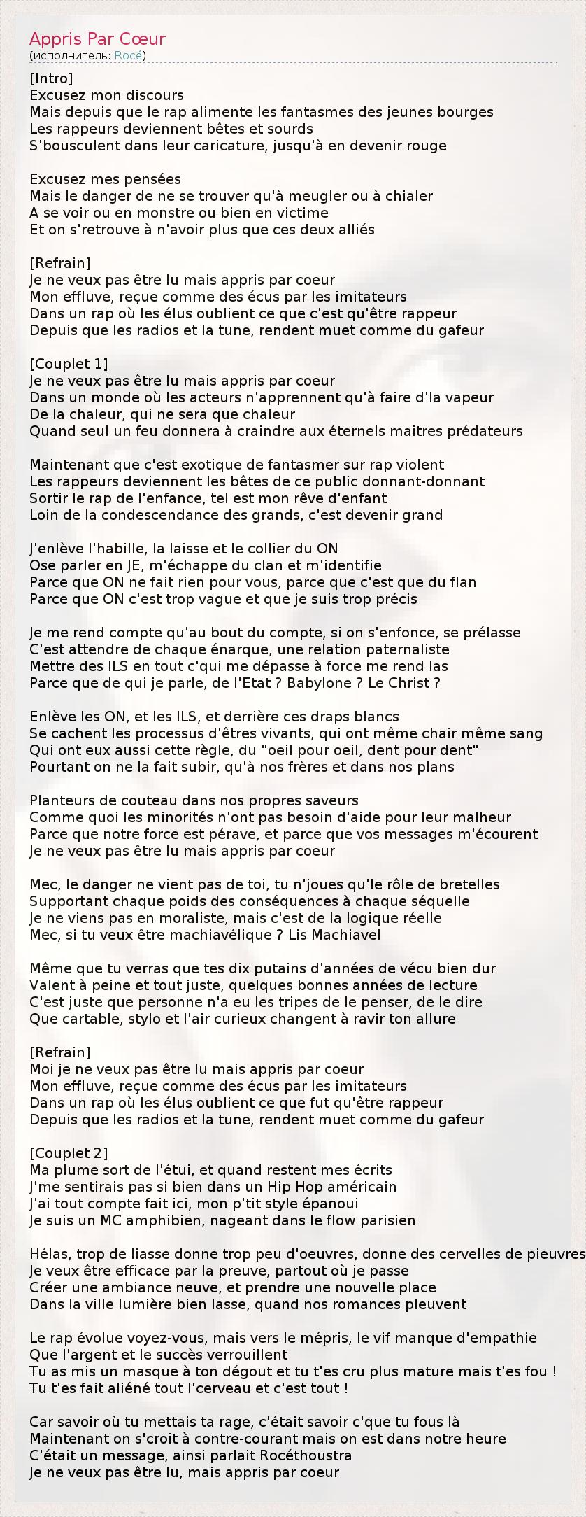 А как ты думаешь, о чем песня "Appris Par Cœur" ?
