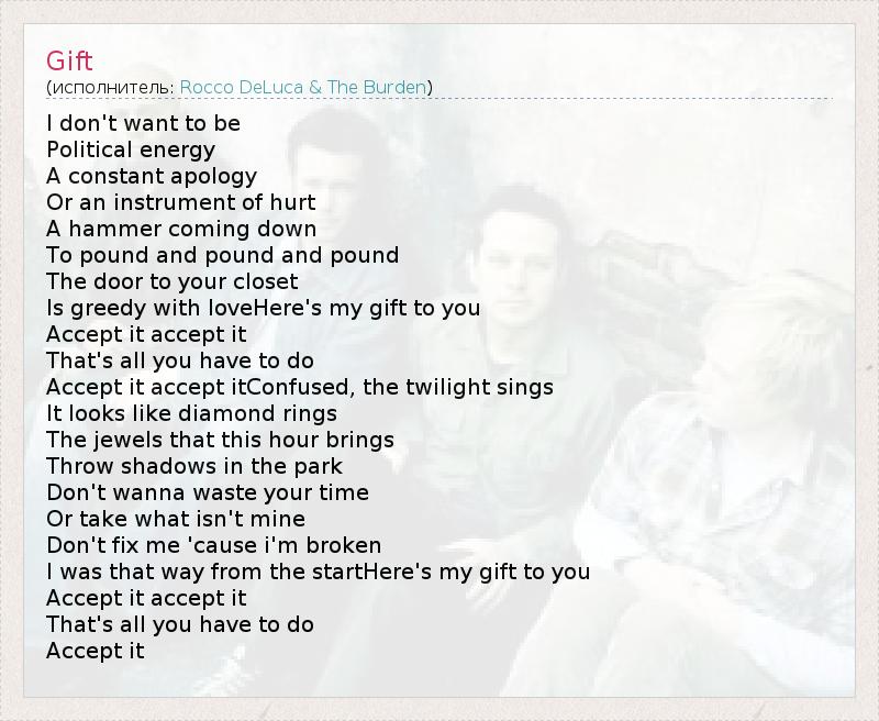 I don't want to be Political energy A constant apology Or an instrument of hurt A hammer coming down To pound and pound and pound The door to your closet Is greedy with loveHere's my gift to you Accept it accept it That's all you have to do Accept it accept itConfused, the twilight sings It looks like diamond rings The jewels that this hour brings Throw shadows in the park Don't wanna waste your time Or take what isn't mine Don't fix me 'cause i'm broken I was that way from the startHere's my gift to you Accept it accept it That's all you have to do Accept it