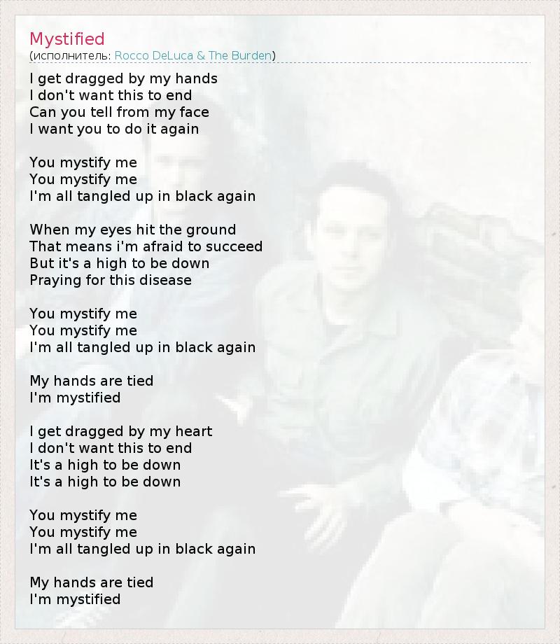 I get dragged by my hands I don't want this to end Can you tell from my face I want you to do it again You mystify me You mystify me I'm all tangled up in black again When my eyes hit the ground That means i'm afraid to succeed But it's a high to be down Praying for this disease You mystify me You mystify me I'm all tangled up in black again My hands are tied I'm mystified I get dragged by my heart I don't want this to end It's a high to be down It's a high to be down You mystify me You mystify me I'm all tangled up in black again My hands are tied I'm mystified