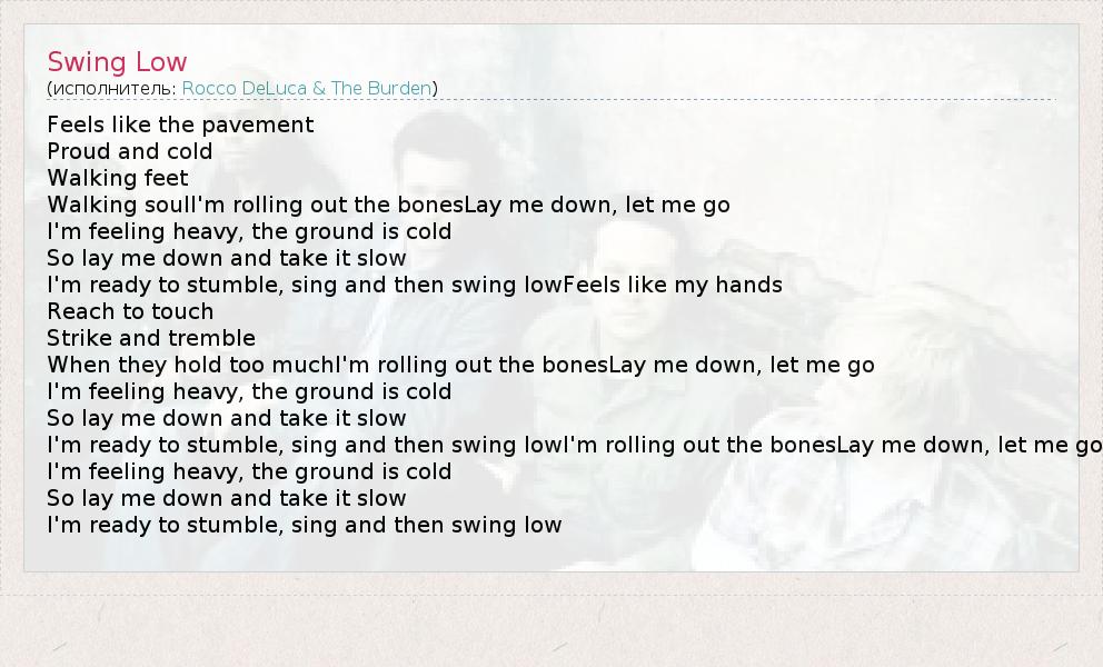 Feels like the pavement Proud and cold Walking feet Walking soulI'm rolling out the bonesLay me down, let me go I'm feeling heavy, the ground is cold So lay me down and take it slow I'm ready to stumble, sing and then swing lowFeels like my hands Reach to touch Strike and tremble When they hold too muchI'm rolling out the bonesLay me down, let me go I'm feeling heavy, the ground is cold So lay me down and take it slow I'm ready to stumble, sing and then swing lowI'm rolling out the bonesLay me down, let me go I'm feeling heavy, the ground is cold So lay me down and take it slow I'm ready to stumble, sing and then swing low