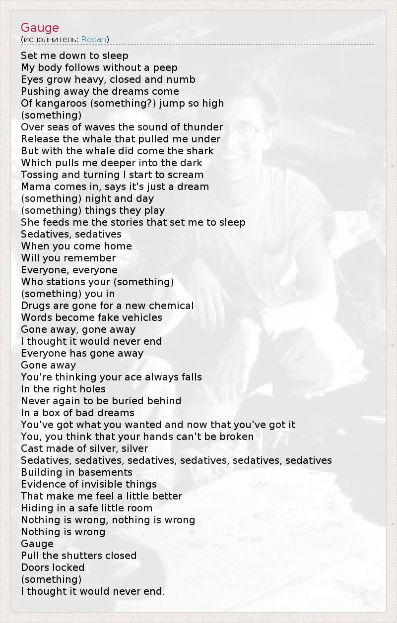 Set me down to sleep My body follows without a peep Eyes grow heavy, closed and numb Pushing away the dreams come Of kangaroos (something?) jump so high (something) Over seas of waves the sound of thunder Release the whale that pulled me under But with the whale did come the shark Which pulls me deeper into the dark Tossing and turning I start to scream Mama comes in, says it's just a dream (something) night and day (something) things they play She feeds me the stories that set me to sleep Sedatives, sedatives When you come home Will you remember Everyone, everyone Who stations your (something) (something) you in Drugs are gone for a new chemical Words become fake vehicles Gone away, gone away I thought it would never end Everyone has gone away Gone away You're thinking your ace always falls In the right holes Never again to be buried behind In a box of bad dreams You've got what you wanted and now that you've got it You, you think that your hands can't be broken Cast made of silver, silver Sedatives, sedatives, sedatives, sedatives, sedatives, sedatives Building in basements Evidence of invisible things That make me feel a little better Hiding in a safe little room Nothing is wrong, nothing is wrong Nothing is wrong Gauge Pull the shutters closed Doors locked (something) I thought it would never end.