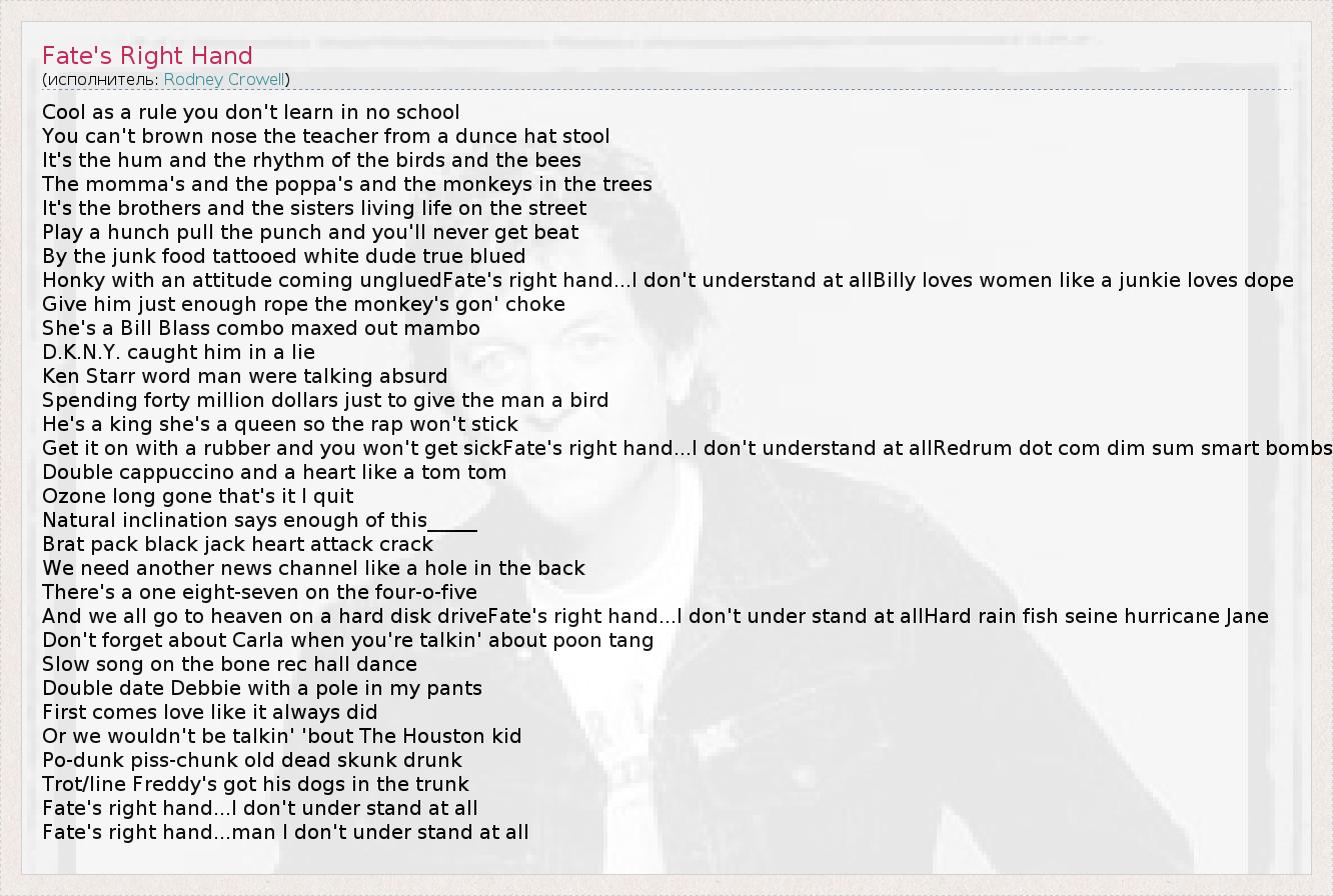 Cool as a rule you don't learn in no school You can't brown nose the teacher from a dunce hat stool It's the hum and the rhythm of the birds and the bees The momma's and the poppa's and the monkeys in the trees It's the brothers and the sisters living life on the street Play a hunch pull the punch and you'll never get beat By the junk food tattooed white dude true blued Honky with an attitude coming ungluedFate's right hand...I don't understand at allBilly loves women like a junkie loves dope Give him just enough rope the monkey's gon' choke She's a Bill Blass combo maxed out mambo D.K.N.Y. caught him in a lie Ken Starr word man were talking absurd Spending forty million dollars just to give the man a bird He's a king she's a queen so the rap won't stick Get it on with a rubber and you won't get sickFate's right hand...I don't understand at allRedrum dot com dim sum smart bombs Double cappuccino and a heart like a tom tom Ozone long gone that's it I quit Natural inclination says enough of this_____ Brat pack black jack heart attack crack We need another news channel like a hole in the back There's a one eight-seven on the four-o-five And we all go to heaven on a hard disk driveFate's right hand...I don't under stand at allHard rain fish seine hurricane Jane Don't forget about Carla when you're talkin' about poon tang Slow song on the bone rec hall dance Double date Debbie with a pole in my pants First comes love like it always did Or we wouldn't be talkin' 'bout The Houston kid Po-dunk piss-chunk old dead skunk drunk Trot/line Freddy's got his dogs in the trunk Fate's right hand...I don't under stand at all Fate's right hand...man I don't under stand at all