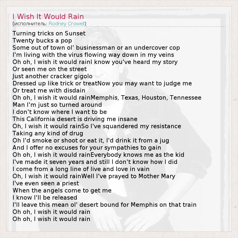 Turning tricks on Sunset Twenty bucks a pop Some out of town ol' businessman or an undercover cop I'm living with the virus flowing way down in my veins Oh oh, I wish it would rainI know you've heard my story Or seen me on the street Just another cracker gigolo Dressed up like trick or treatNow you may want to judge me Or treat me with disdain Oh oh, I wish it would rainMemphis, Texas, Houston, Tennessee Man I'm just so turned around I don't know where I want to be This California desert is driving me insane Oh, I wish it would rainSo I've squandered my resistance Taking any kind of drug Oh I'd smoke or shoot or eat it, I'd drink it from a jug And I offer no excuses for your sympathies to gain Oh oh, I wish it would rainEverybody knows me as the kid I've made it seven years and still I don't know how I did I come from a long line of live and love in vain Oh, I wish it would rainWell I've prayed to Mother Mary I've even seen a priest When the angels come to get me I know I'll be released I'll leave this mean ol' desert bound for Memphis on that train Oh oh, I wish it would rain Oh oh, I wish it would rain