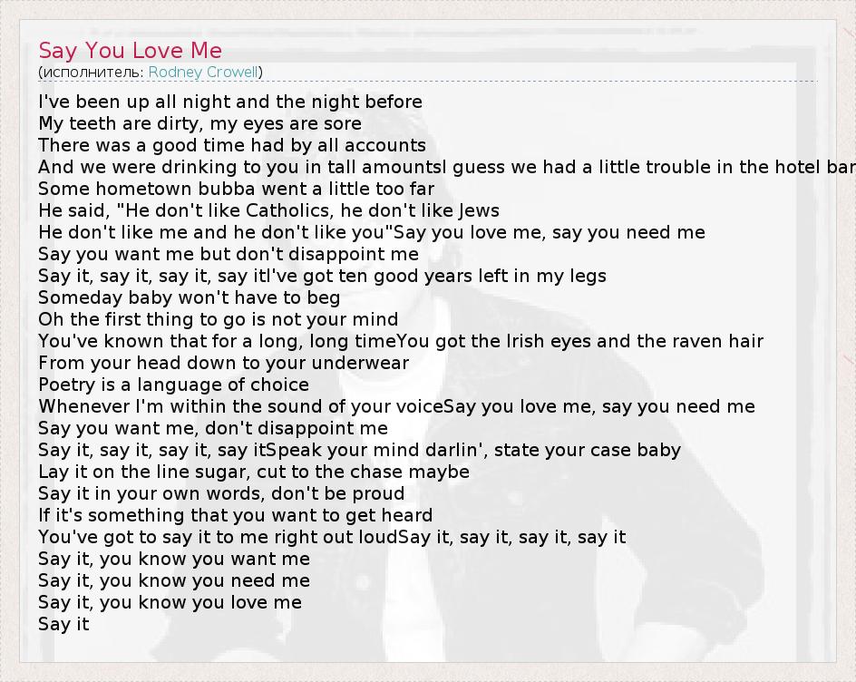 I've been up all night and the night before My teeth are dirty, my eyes are sore There was a good time had by all accounts And we were drinking to you in tall amountsI guess we had a little trouble in the hotel bar Some hometown bubba went a little too far He said, "He don't like Catholics, he don't like Jews He don't like me and he don't like you"Say you love me, say you need me Say you want me but don't disappoint me Say it, say it, say it, say itI've got ten good years left in my legs Someday baby won't have to beg Oh the first thing to go is not your mind You've known that for a long, long timeYou got the Irish eyes and the raven hair From your head down to your underwear Poetry is a language of choice Whenever I'm within the sound of your voiceSay you love me, say you need me Say you want me, don't disappoint me Say it, say it, say it, say itSpeak your mind darlin', state your case baby Lay it on the line sugar, cut to the chase maybe Say it in your own words, don't be proud If it's something that you want to get heard You've got to say it to me right out loudSay it, say it, say it, say it Say it, you know you want me Say it, you know you need me Say it, you know you love me Say it