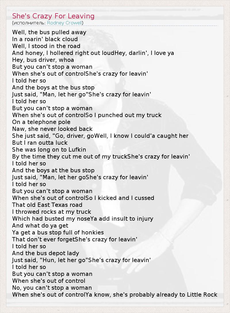 Well, the bus pulled away In a roarin' black cloud Well, I stood in the road And honey, I hollered right out loudHey, darlin', I love ya Hey, bus driver, whoa But you can't stop a woman When she's out of controlShe's crazy for leavin' I told her so And the boys at the bus stop Just said, "Man, let her go"She's crazy for leavin' I told her so But you can't stop a woman When she's out of controlSo I punched out my truck On a telephone pole Naw, she never looked back She just said, "Go, driver, goWell, I know I could'a caught her But I ran outta luck She was long on to Lufkin By the time they cut me out of my truckShe's crazy for leavin' I told her so And the boys at the bus stop Just said, "Man, let her goShe's crazy for leavin' I told her so But you can't stop a woman When she's out of controlSo I kicked and I cussed That old East Texas road I throwed rocks at my truck Which had busted my noseYa add insult to injury And what do ya get Ya get a bus stop full of honkies That don't ever forgetShe's crazy for leavin' I told her so And the bus depot lady Just said, "Hun, let her go"She's crazy for leavin' I told her so But you can't stop a woman When she's out of control No, you can't stop a woman When she's out of controlYa know, she's probably already to Little Rock