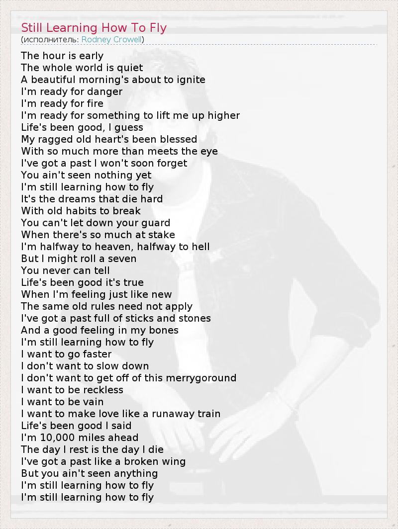 The hour is early The whole world is quiet A beautiful morning's about to ignite I'm ready for danger I'm ready for fire I'm ready for something to lift me up higher Life's been good, I guess My ragged old heart's been blessed With so much more than meets the eye I've got a past I won't soon forget You ain't seen nothing yet I'm still learning how to fly It's the dreams that die hard With old habits to break You can't let down your guard When there's so much at stake I'm halfway to heaven, halfway to hell But I might roll a seven You never can tell Life's been good it's true When I'm feeling just like new The same old rules need not apply I've got a past full of sticks and stones And a good feeling in my bones I'm still learning how to fly I want to go faster I don't want to slow down I don't want to get off of this merrygoround I want to be reckless I want to be vain I want to make love like a runaway train Life's been good I said I'm 10,000 miles ahead The day I rest is the day I die I've got a past like a broken wing But you ain't seen anything I'm still learning how to fly I'm still learning how to fly