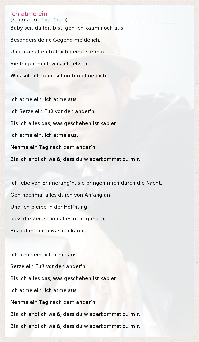 Baby seit du fort bist, geh ich kaum noch aus. Besonders deine Gegend meide ich. Und nur selten treff ich deine Freunde. Sie fragen mich was ich jetz tu. Was soll ich denn schon tun ohne dich. Ich atme ein, ich atme aus. Ich Setze ein Fuß vor den ander'n. Bis ich alles das, was geschehen ist kapier. Ich atme ein, ich atme aus. Nehme ein Tag nach dem ander'n. Bis ich endlich weiß, dass du wiederkommst zu mir. Ich lebe von Erinnerung'n, sie bringen mich durch die Nacht. Geh nochmal alles durch von Anfang an. Und ich bleibe in der Hoffnung, dass die Zeit schon alles richtig macht. Bis dahin tu ich was ich kann. Ich atme ein, ich atme aus. Setze ein Fuß vor den ander'n. Bis ich alles das, was geschehen ist kapier. Ich atme ein, ich atme aus. Nehme ein Tag nach dem ander'n. Bis ich endlich weiß, dass du wiederkommst zu mir. Bis ich endlich weiß, dass du wiederkommst zu mir.