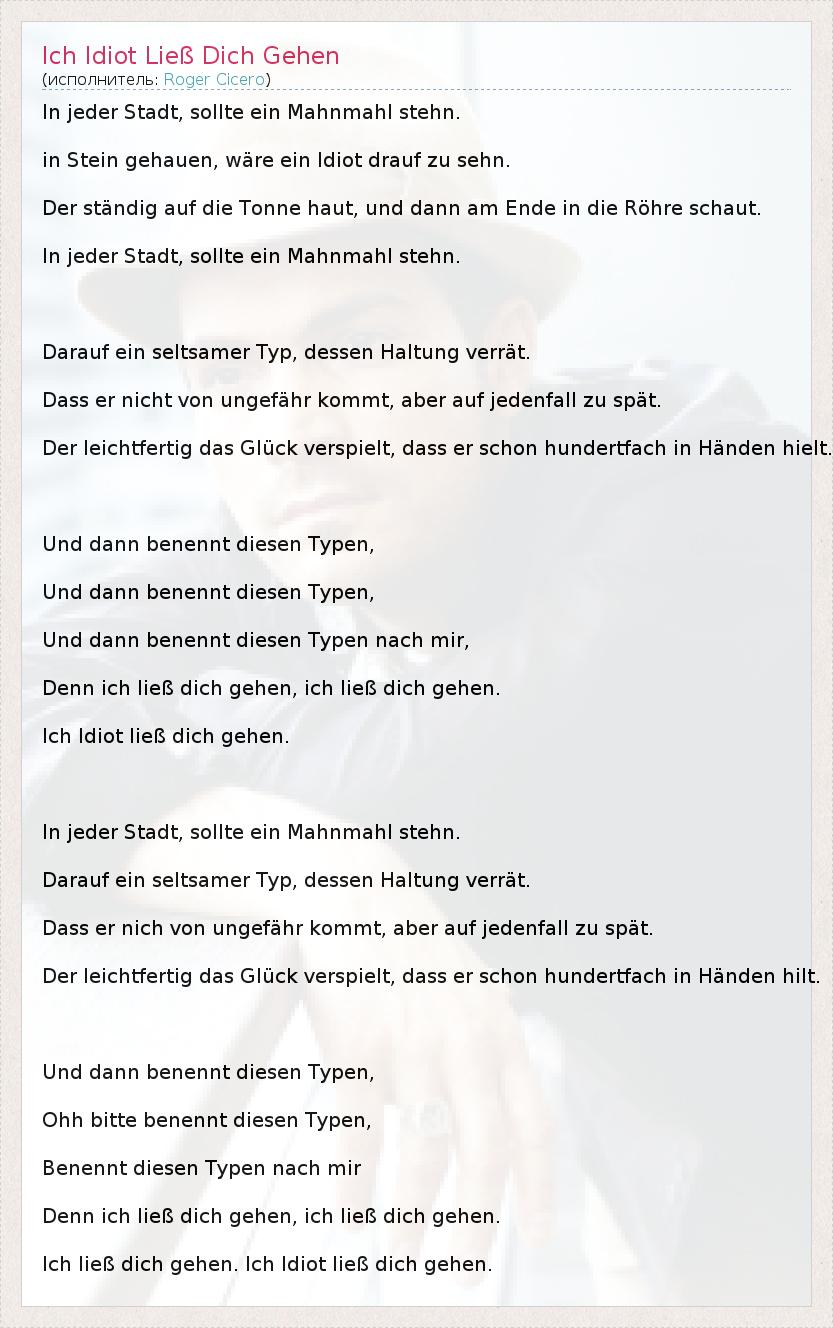 In jeder Stadt, sollte ein Mahnmahl stehn. in Stein gehauen, wäre ein Idiot drauf zu sehn. Der ständig auf die Tonne haut, und dann am Ende in die Röhre schaut. In jeder Stadt, sollte ein Mahnmahl stehn. Darauf ein seltsamer Typ, dessen Haltung verrät. Dass er nicht von ungefähr kommt, aber auf jedenfall zu spät. Der leichtfertig das Glück verspielt, dass er schon hundertfach in Händen hielt. Und dann benennt diesen Typen, Und dann benennt diesen Typen, Und dann benennt diesen Typen nach mir, Denn ich ließ dich gehen, ich ließ dich gehen. Ich Idiot ließ dich gehen. In jeder Stadt, sollte ein Mahnmahl stehn. Darauf ein seltsamer Typ, dessen Haltung verrät. Dass er nich von ungefähr kommt, aber auf jedenfall zu spät. Der leichtfertig das Glück verspielt, dass er schon hundertfach in Händen hilt. Und dann benennt diesen Typen, Ohh bitte benennt diesen Typen, Benennt diesen Typen nach mir Denn ich ließ dich gehen, ich ließ dich gehen. Ich ließ dich gehen. Ich Idiot ließ dich gehen.