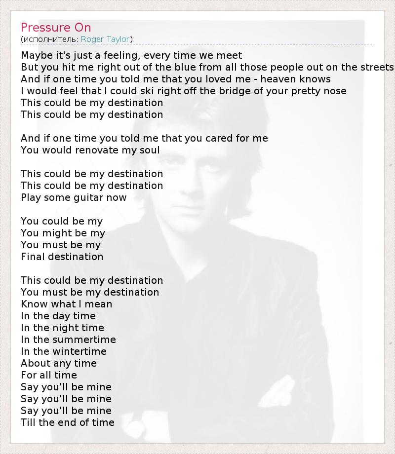 Maybe it's just a feeling, every time we meet But you hit me right out of the blue from all those people out on the streets And if one time you told me that you loved me - heaven knows I would feel that I could ski right off the bridge of your pretty nose This could be my destination This could be my destination And if one time you told me that you cared for me You would renovate my soul This could be my destination This could be my destination Play some guitar now You could be my You might be my You must be my Final destination This could be my destination You must be my destination Know what I mean In the day time In the night time In the summertime In the wintertime About any time For all time Say you'll be mine Say you'll be mine Say you'll be mine Till the end of time