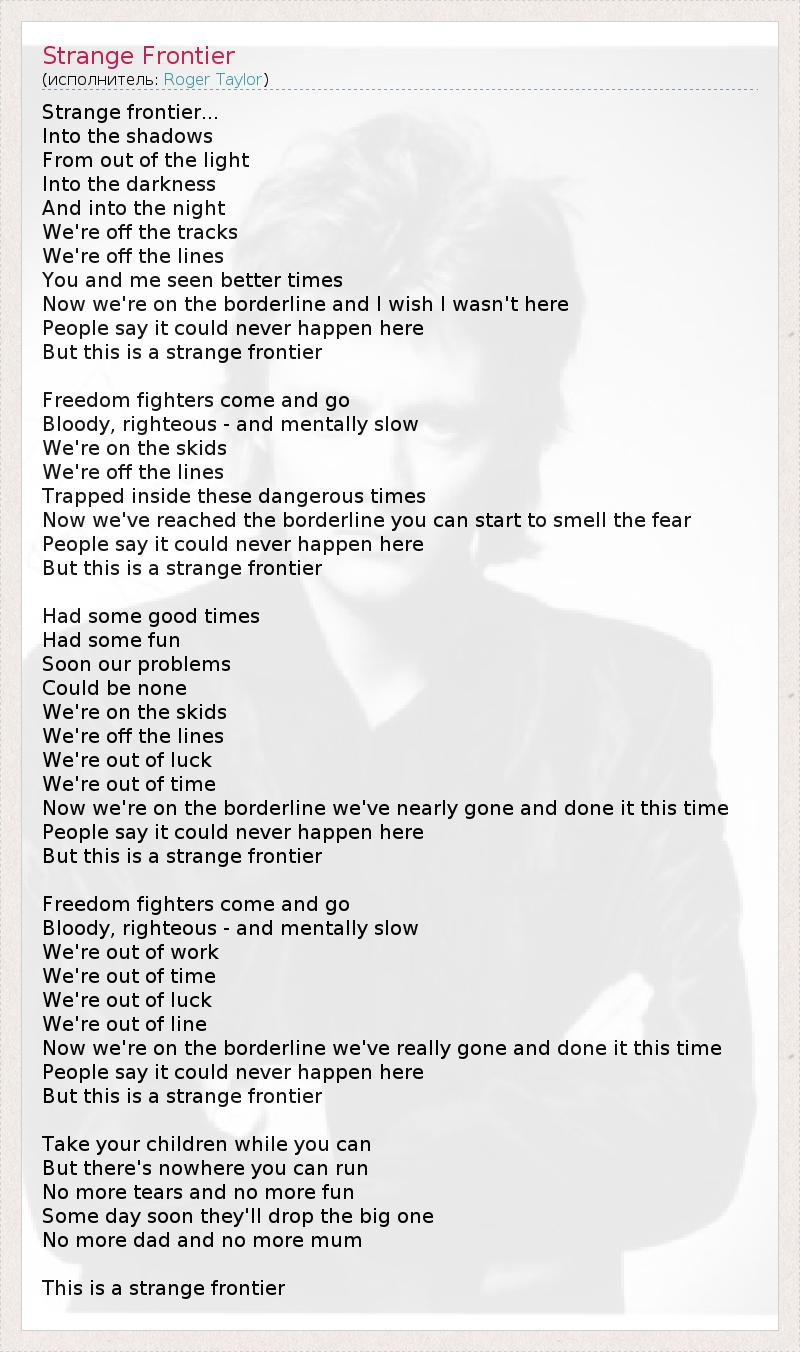 Strange frontier... Into the shadows From out of the light Into the darkness And into the night We're off the tracks We're off the lines You and me seen better times Now we're on the borderline and I wish I wasn't here People say it could never happen here But this is a strange frontier Freedom fighters come and go Bloody, righteous - and mentally slow We're on the skids We're off the lines Trapped inside these dangerous times Now we've reached the borderline you can start to smell the fear People say it could never happen here But this is a strange frontier Had some good times Had some fun Soon our problems Could be none We're on the skids We're off the lines We're out of luck We're out of time Now we're on the borderline we've nearly gone and done it this time People say it could never happen here But this is a strange frontier Freedom fighters come and go Bloody, righteous - and mentally slow We're out of work We're out of time We're out of luck We're out of line Now we're on the borderline we've really gone and done it this time People say it could never happen here But this is a strange frontier Take your children while you can But there's nowhere you can run No more tears and no more fun Some day soon they'll drop the big one No more dad and no more mum This is a strange frontier